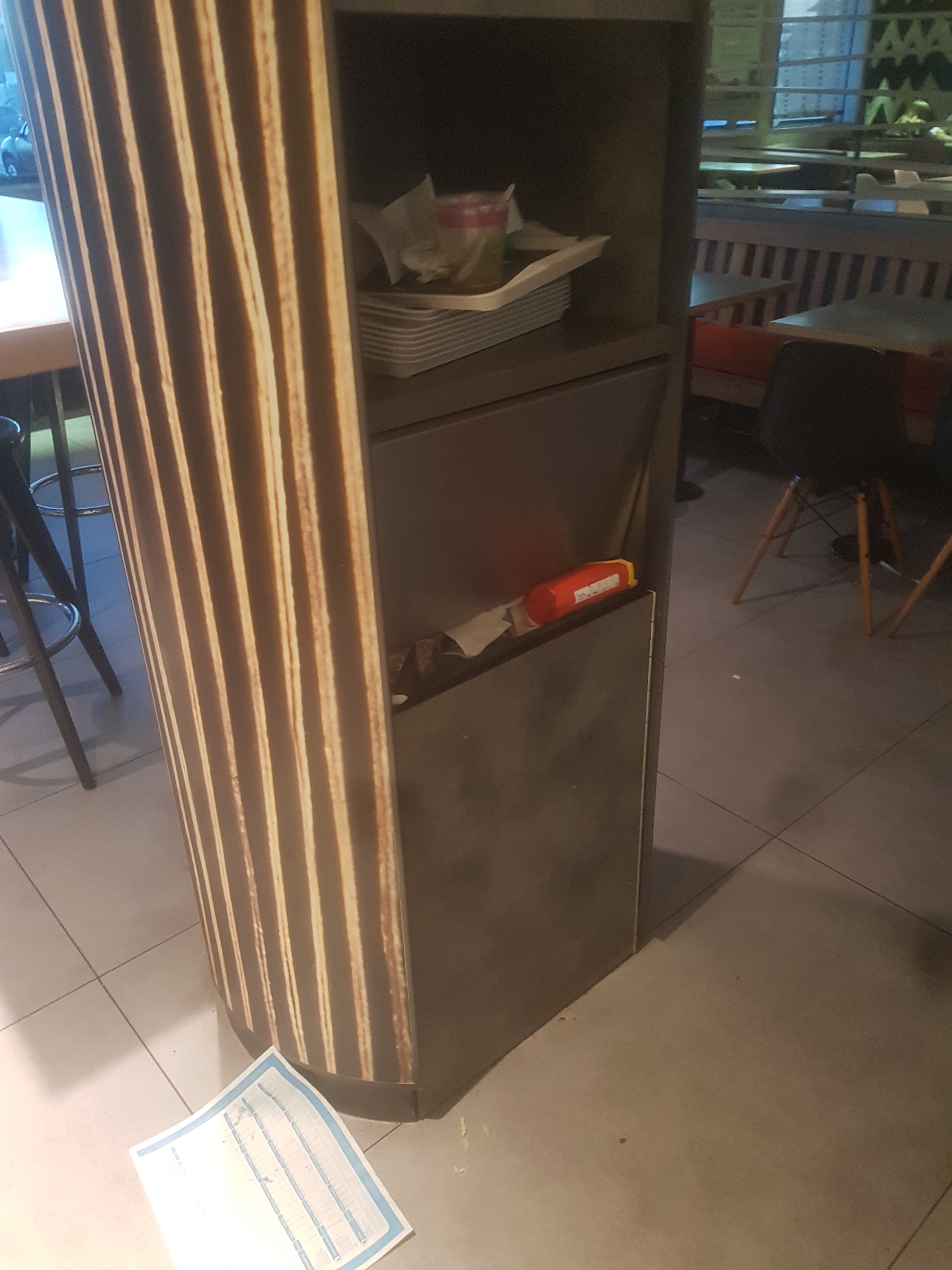Restaurant sale beaucoup d’oublie dans les commandes où ils ce trompent dans la commande et les poubelles qui débordent cela ne fait pas très propre je ne trouve pas ça très intelligent de ranger eux même si il changerait les poubelles pour qu’on puisse vider nos plateaux ce serait mieux puis ils ce rajoute du travail en plus en faisant ça mais bon c’est leurs problèmes..