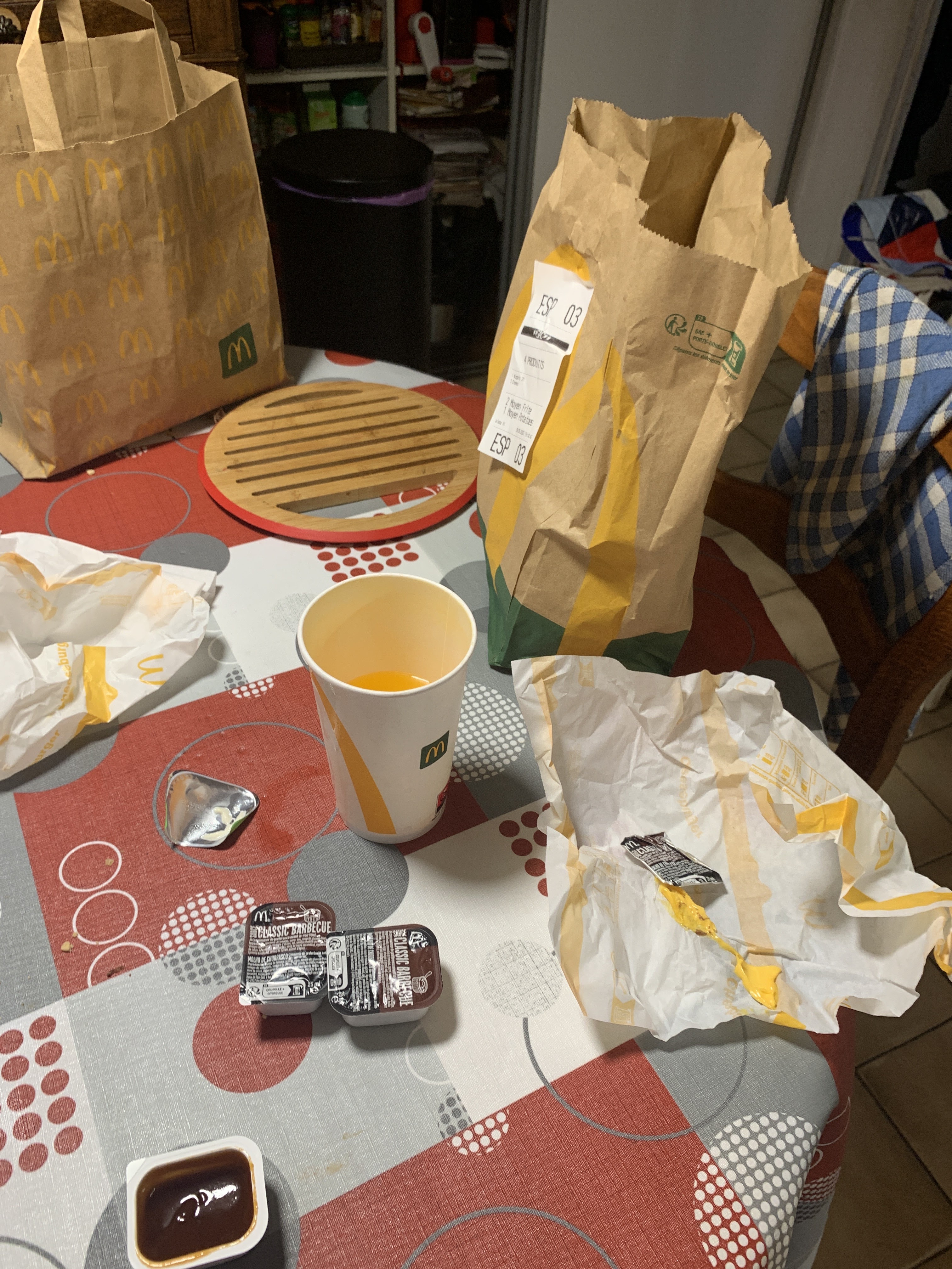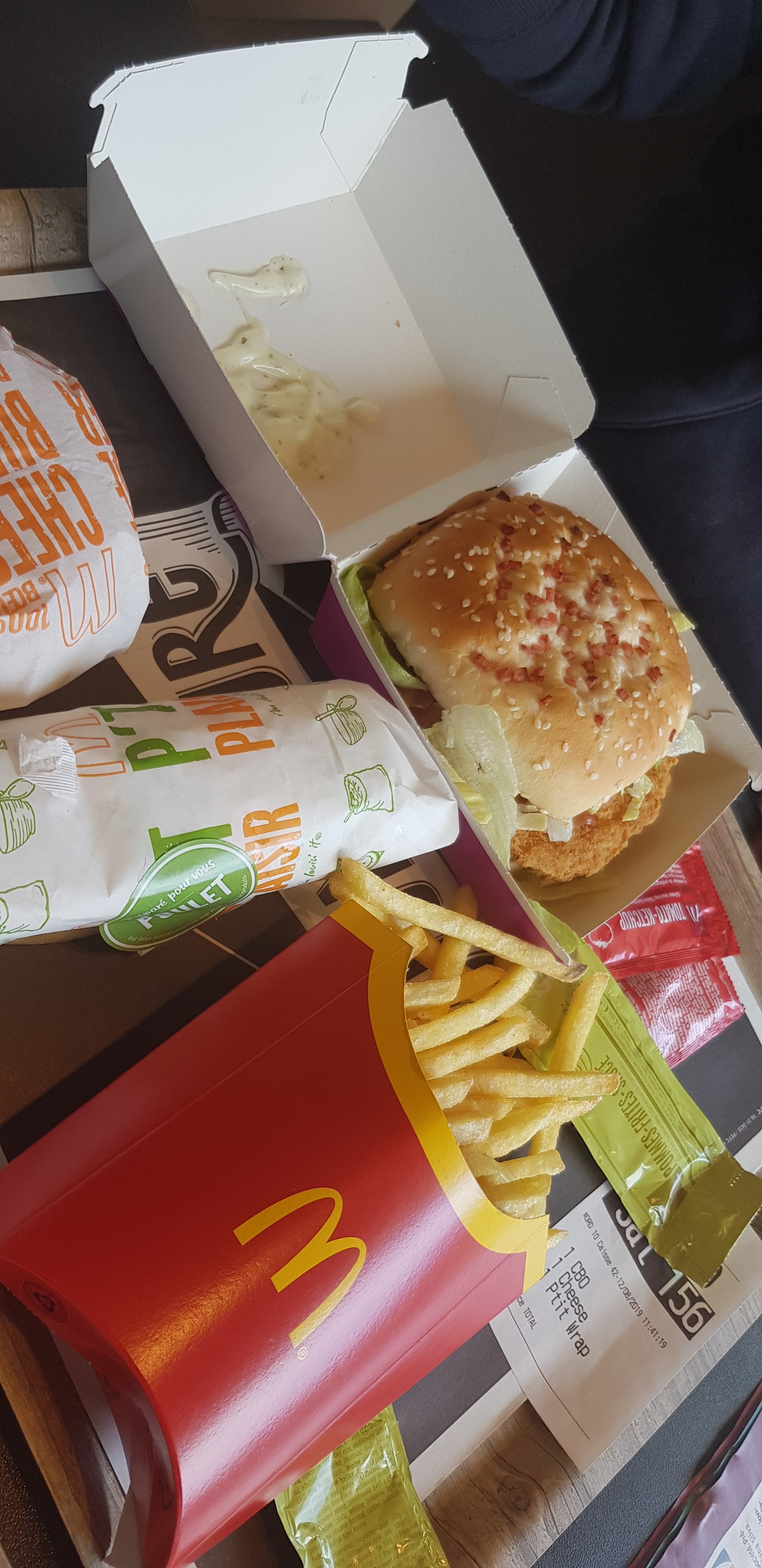 Dimanche 12h30, salle 1/3 pleine, personnel complètement dépassé. Commande à emporter, contrôle du sac, manque une sauce (bon ça c'est un classique), 2 jouets dans le Happy meal (cool!), 2 yaourts dans le Happy meal (re-cool!), mais le top c'est un 280 avec à la place du steack un poisson pané 🤣