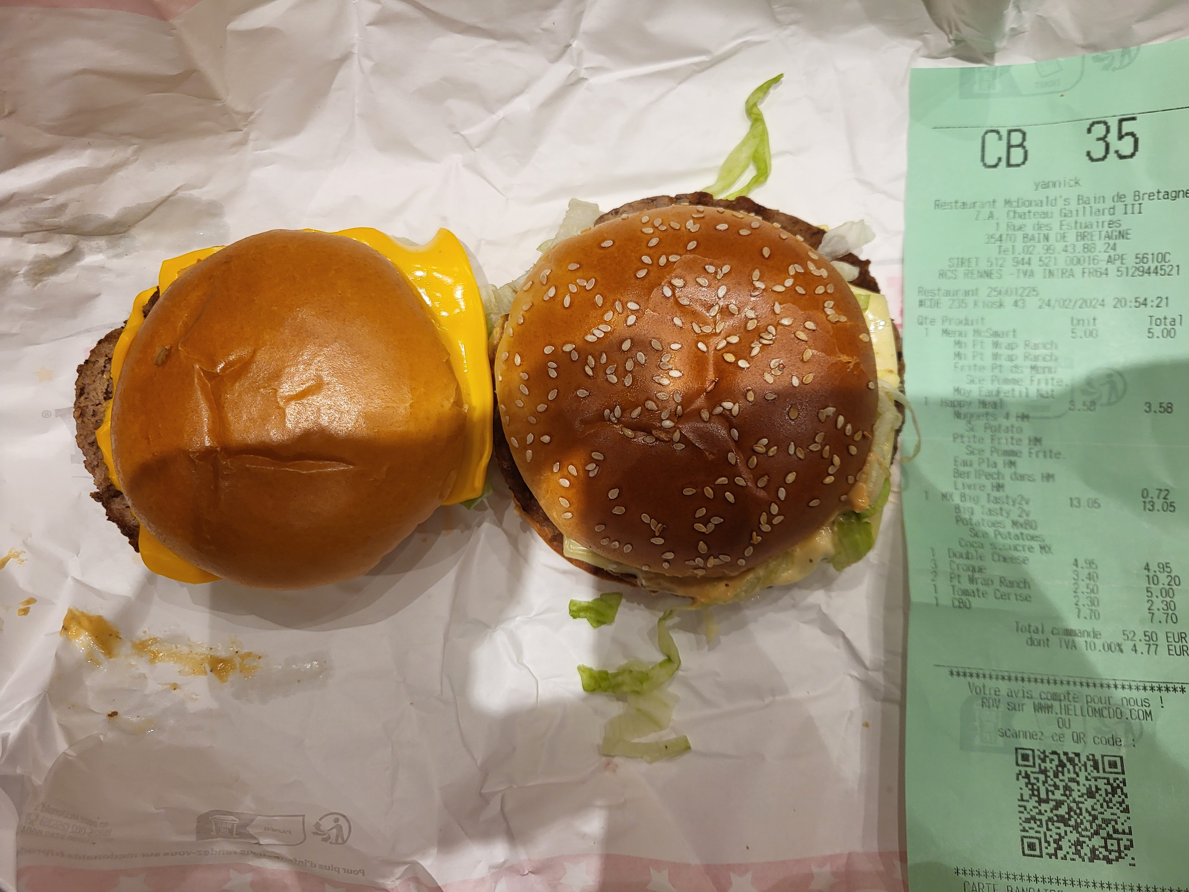 Malgré quelques effort il ne faut j'aimais être pressé. Et il manque toujours quelqu'un chose tranche de bacon jeux/livre du happy meal, pas la bonne boisson..... bref nouveau croque à moitié croqué du rafistolage, manque des morceaux. A priori juste erreur de manipulation avec la pince... Ocotibre 2022 Encore nouvelle fois, nouvelle boulette, on paye pour sandwich avec bacon et pas de bacon, on a beau insisté sur les compo des burger toujours aucune réaction. Pain burger décomposé... bref