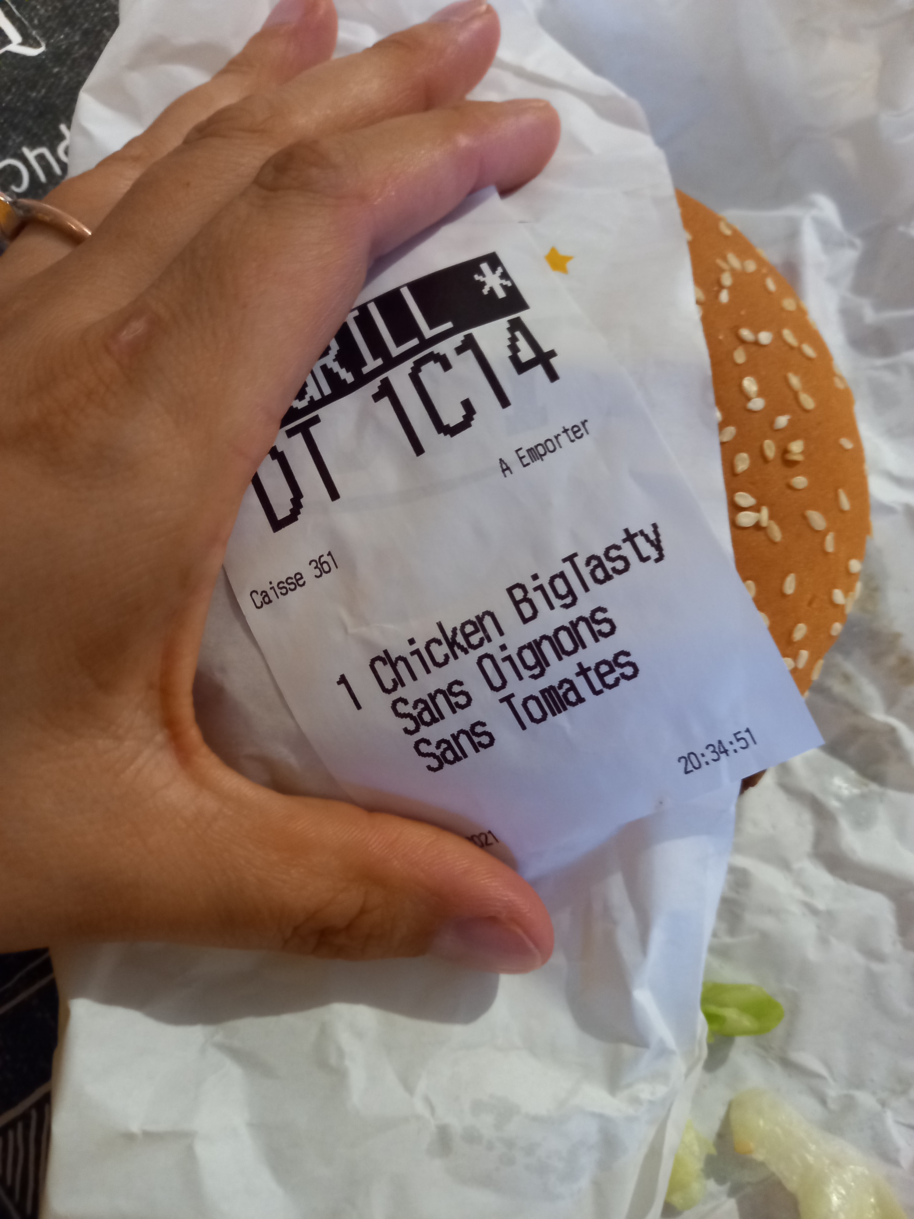 Pour la énième fois encore une erreur dans ma commande, et encore des produits manquants, ce deviens pénible, tu commande un big tasty poulet sans tomates et sans oignons et tu te retrouve avec un big tasty bœuf avec tomate. Bref à chaque passage c'est toujours pareil, et pourtant nous venons mangez régulièrement depuis son ouverture. Un peu plus de professionnalisme serait le bienvenu ou au moins vérifier vos sacs avant de les donnés aux clients!!!!