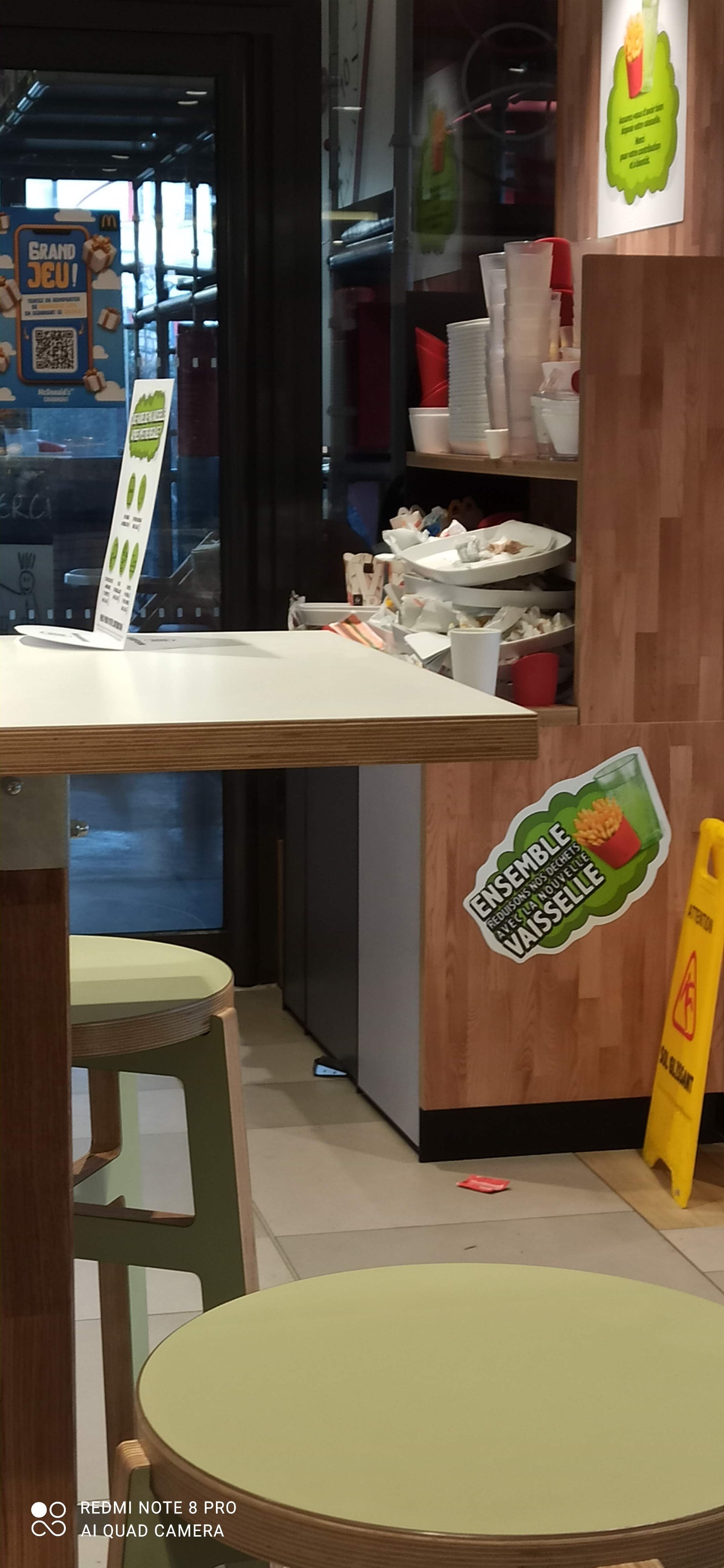 Un des pires mc do de France. Le sol du restaurant est sale ! Il est gras et en sortant un de nous à trébucher sur le sol en marchant sur le passage sécurisé pour malvoyant (demi rond blanc sur la bande blanche). Pas de nettoyage de sale plus ou moins propre. Personnel non chaland malgré la présence du gérant. 20 minutes après la commande, nous attendions d'être appelé pour l'encaissement. Il y avait au moins 4 tables avant nous à attendre sa commande. Le personnel était environ 5/7 largement gérable avec le drive. Résultat direction la concurrence à 900m environ. Avec 3/4 membres du personnel et pour le même nombre de client et voiture c'était servi en 10 minutes.