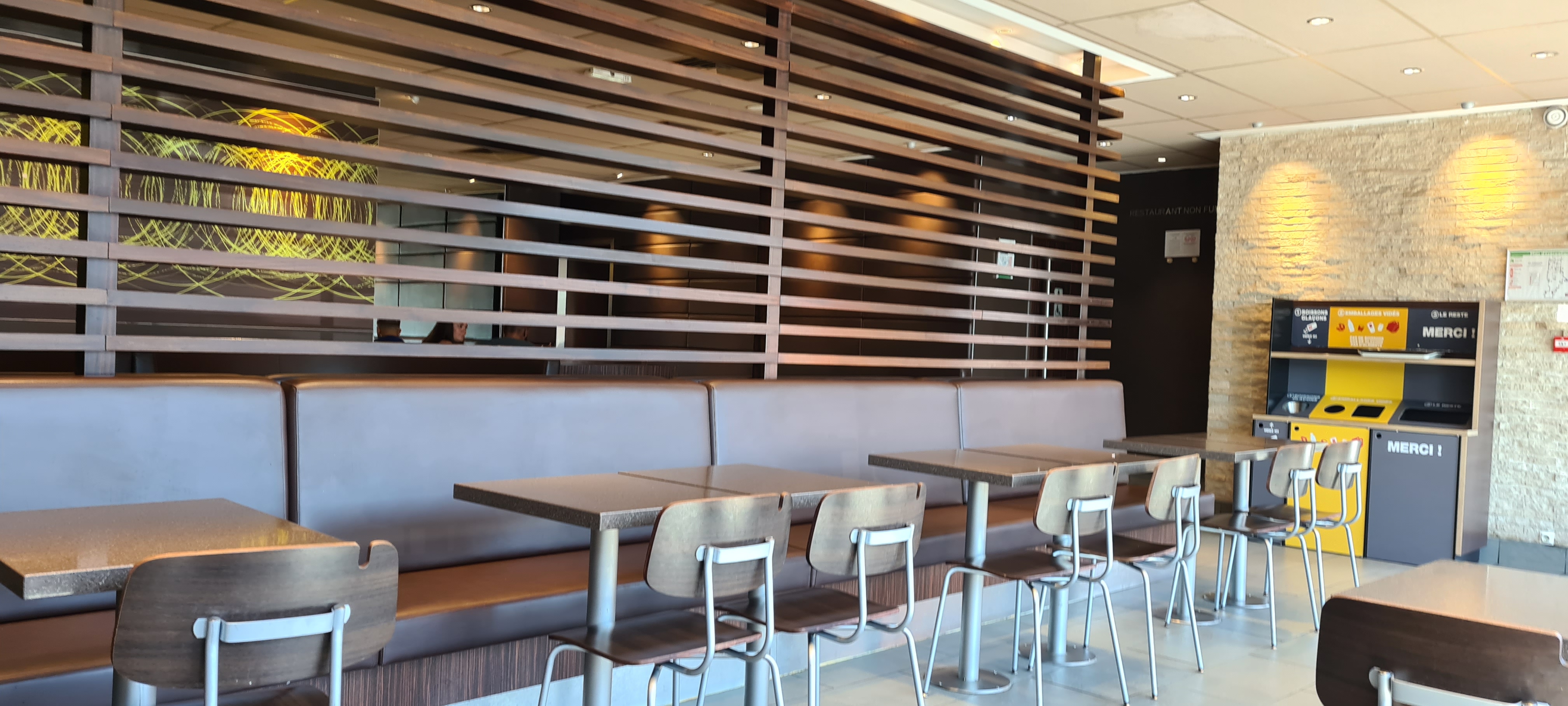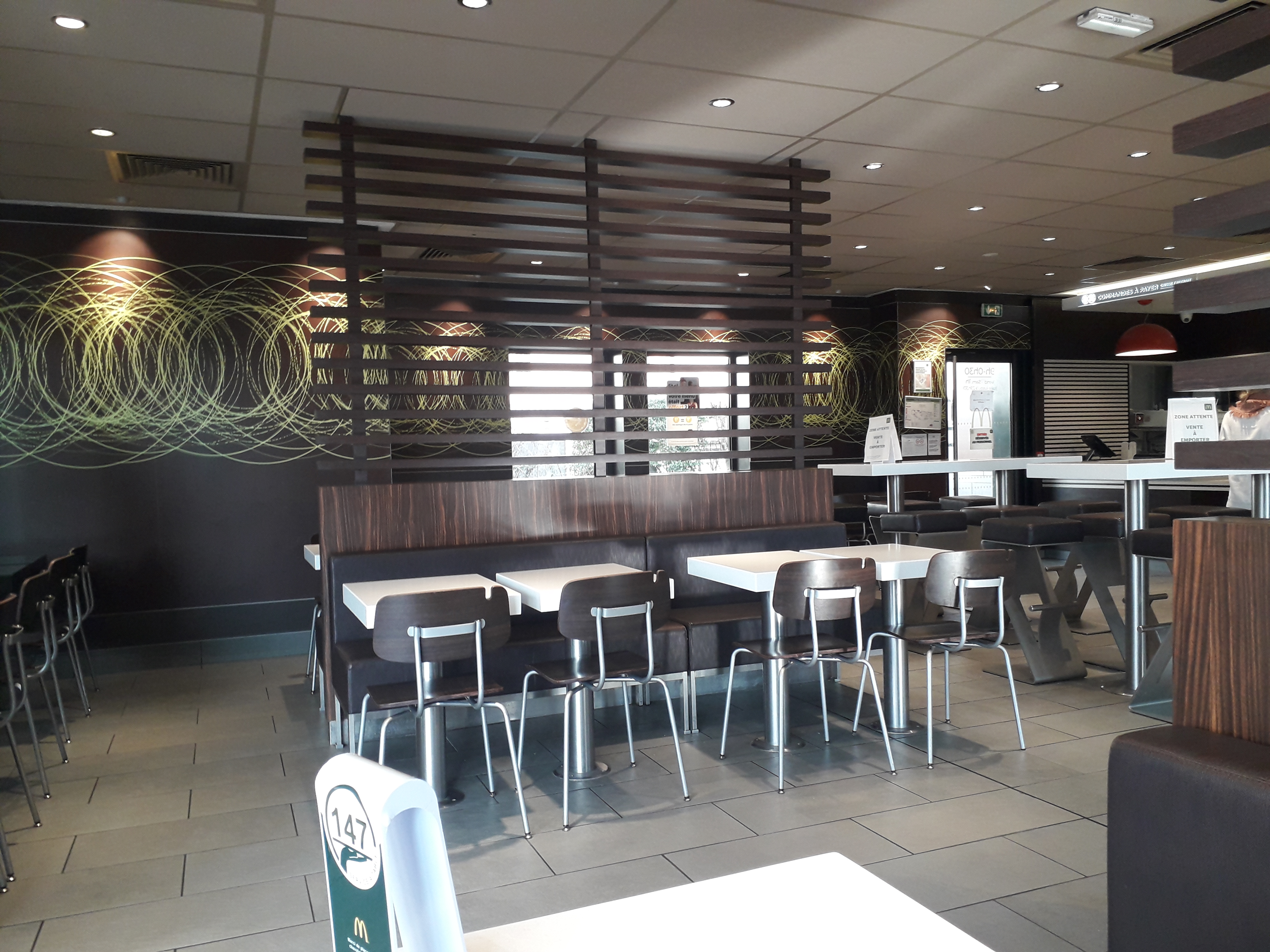 Salle et WC très propre et qui fait neuf. Nourriture c'est du macdo 😅. Personnel souriant.