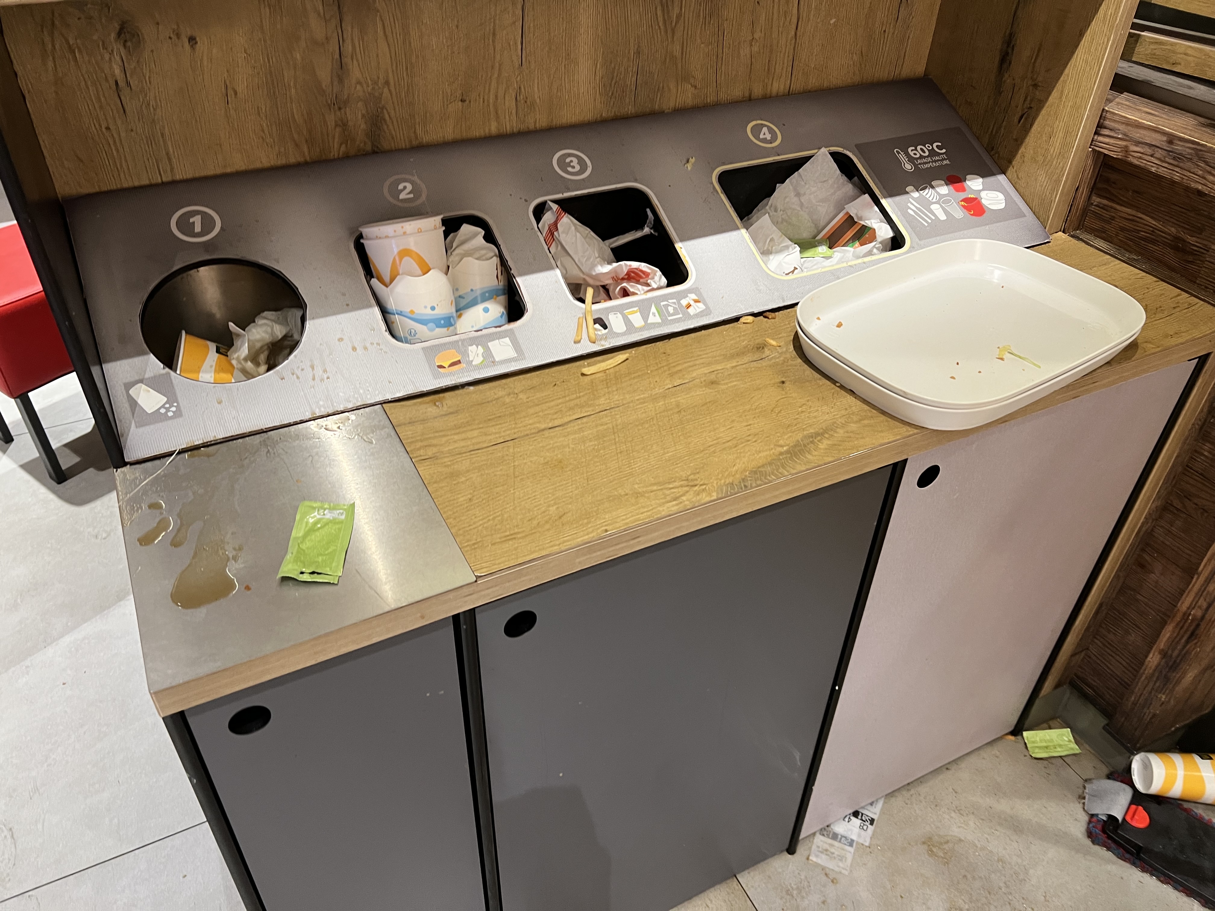 Mac do salle. Il est 14h, à peine 20 clients et aucune table de propre ou s'installer. Les poubelles débordent et personne ne fait rien. Je repart 30 min plus tard et rien à changé... Ou sont les équipiers et le managers ?