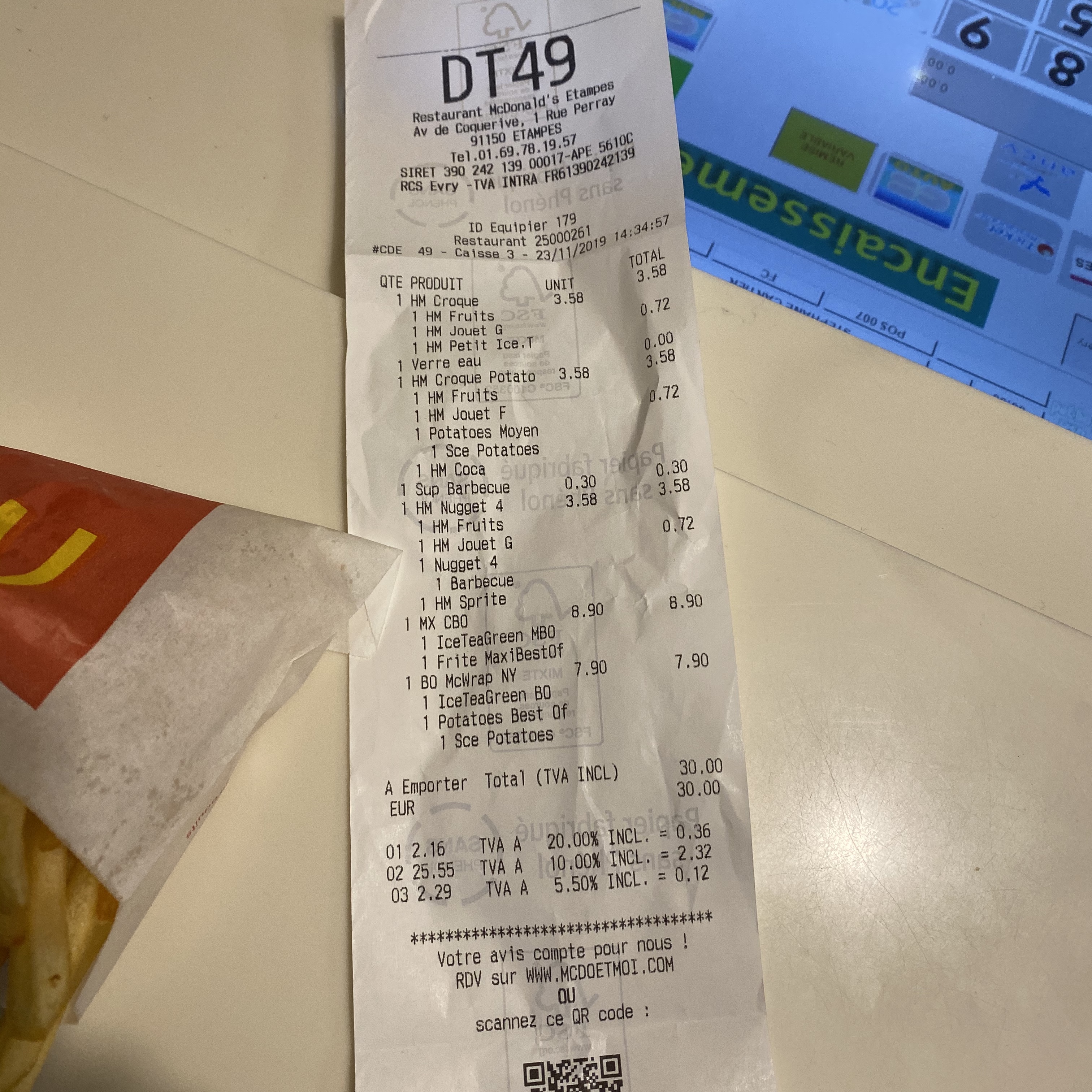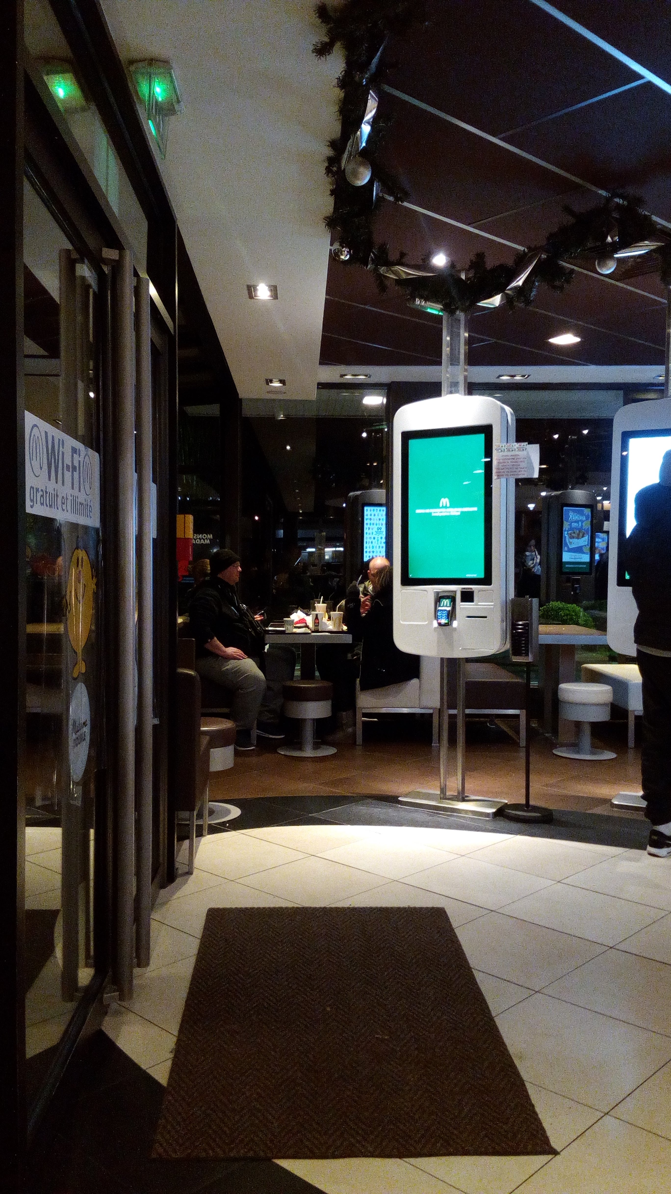 En pleine commande sur la borne Plus de rouleau pour imprimer Rebelote- Le café latte n a que du lait a 3,30€ ?? C est vraiment exagéré L attente était longue pour une commande à emporter 10mn : point de livre dans le happy meal . Ni de mayonnaise ni ketchup Pas l ombre d une serviette:( :(