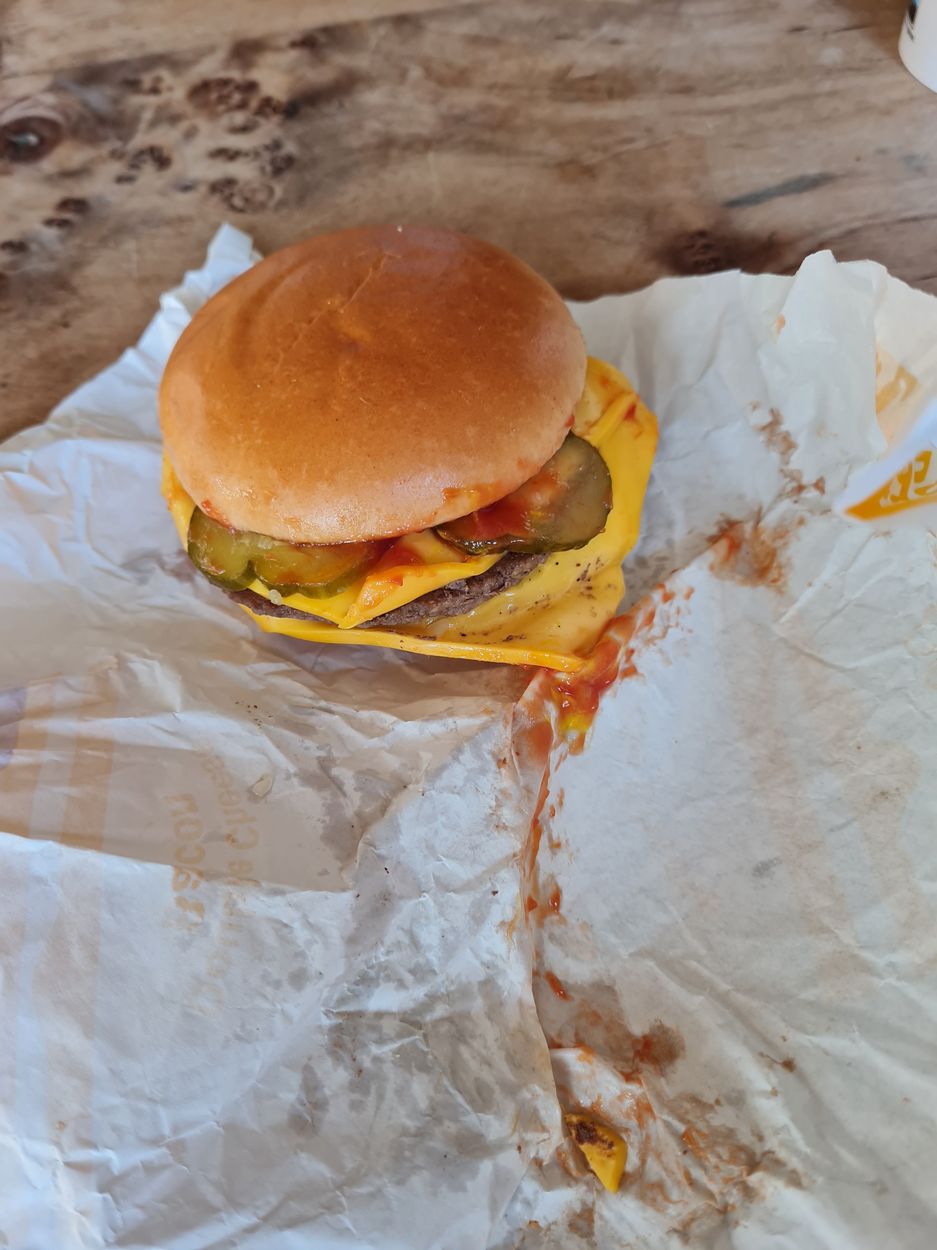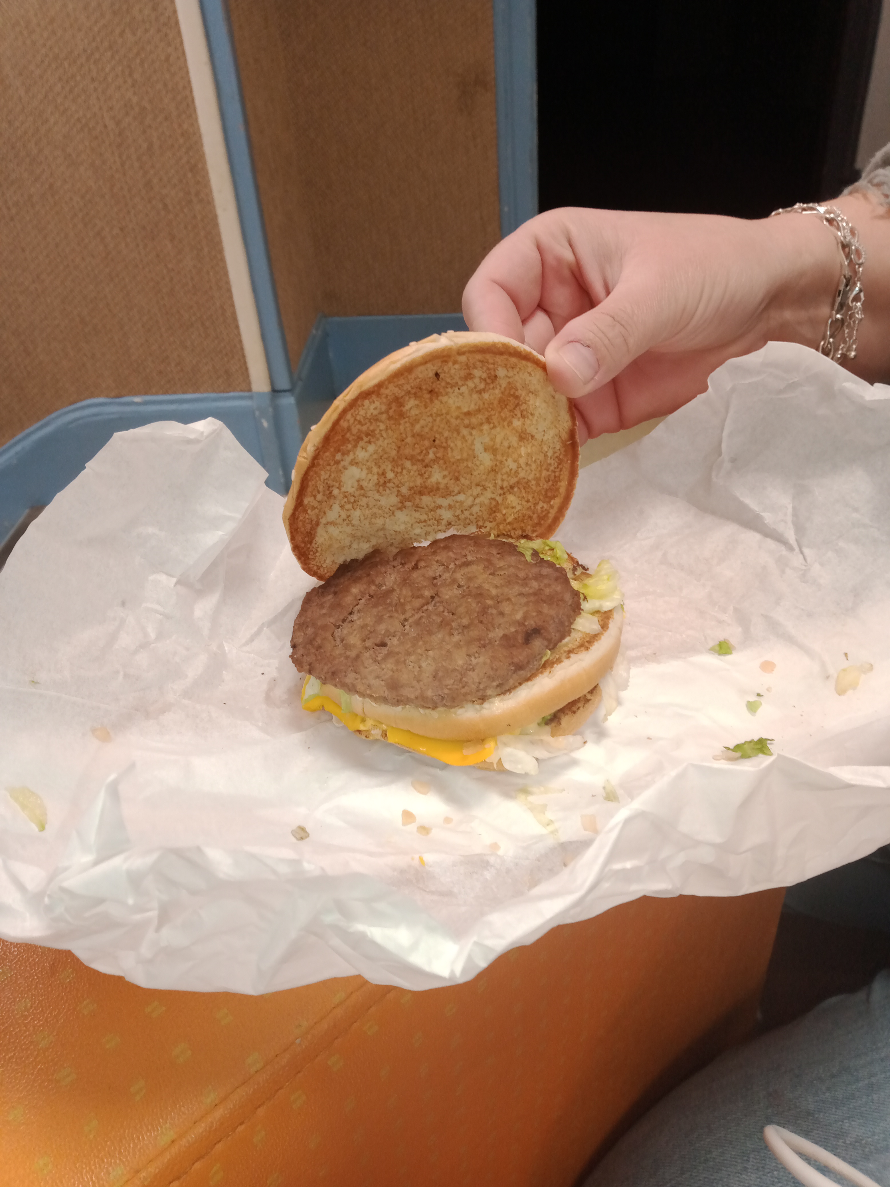 2 hamburgers dont 1 menu Big Mac et 1 double cheese commandés sur place. Servis à table après 10/15 mn d’attente. Priorité est donné aux livraisons Uber Eats et Drive ! Les 2 hamburgers étaient tièdes / froids ! Pas savoureux 6 Potatoes !!! version plat pour enfant ?! Coca Cola bien trop de glaçons qui plus est fondus résultat, Saveur : eau + sirop ! Ambiance : très bruyant ! Que faire ? Ne plus y aller ?!