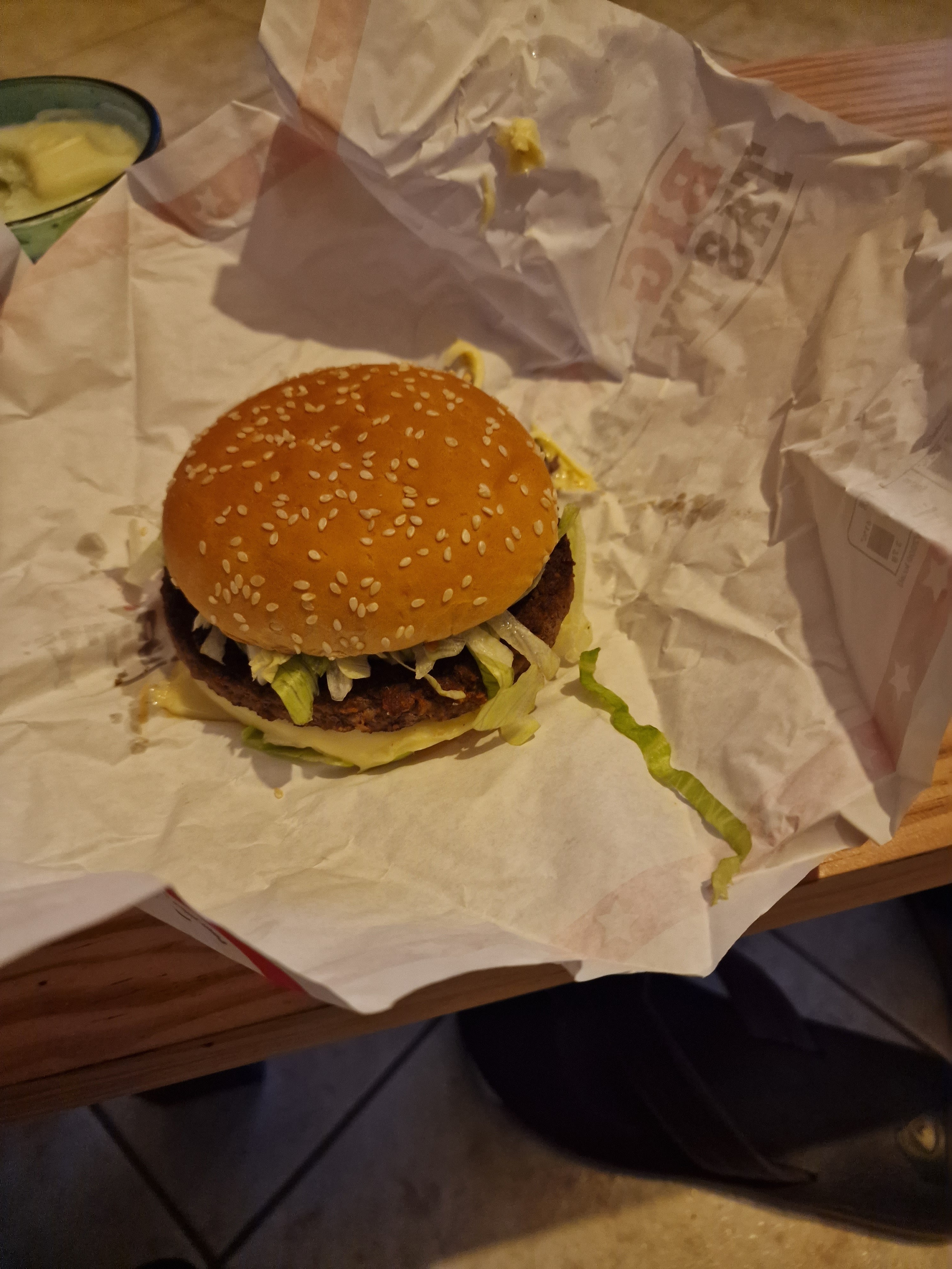 Arrivée un samedi midi vers 12h15, bornes de commande dispo immédiatement, service rapide et aimable à table. Nos deux hamburgers étaient très frais et ressemblaient vraiment à la pub pour une fois !