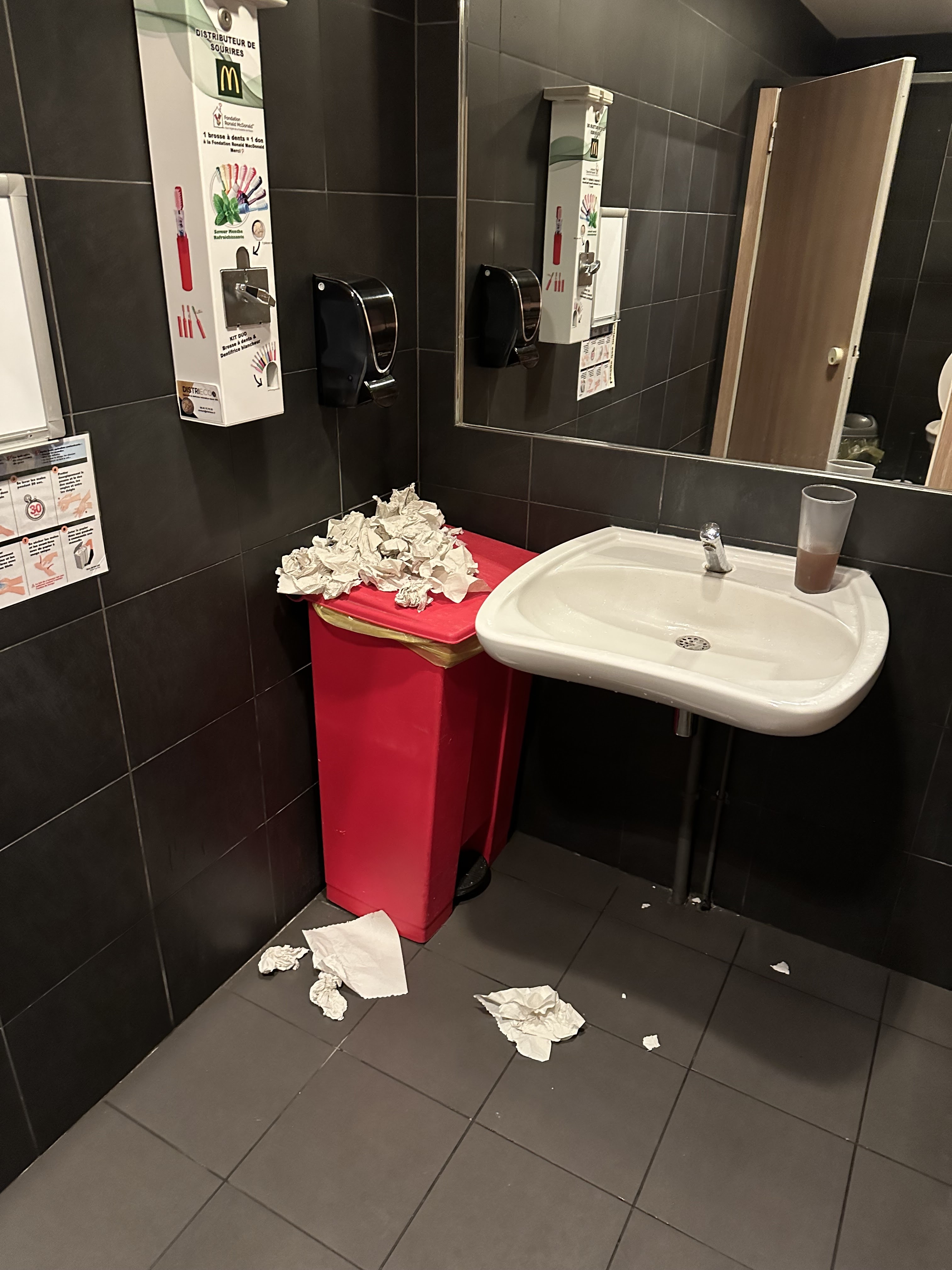 Parlons en premier des sanitaires pas de papier pas de savon sèche Mains hs Certes c'est marqué veuillez venir nous voir si il manque quelque chose mais quand on c lave les mains trop tard toilettes sale Sol du restaurant dégueulasse table pas nettoyé Très navrant je n'es jamais vu un mac do aussi sale et pourtant j'en côtoie souvent ac mes enfants Parfaitement imparfait