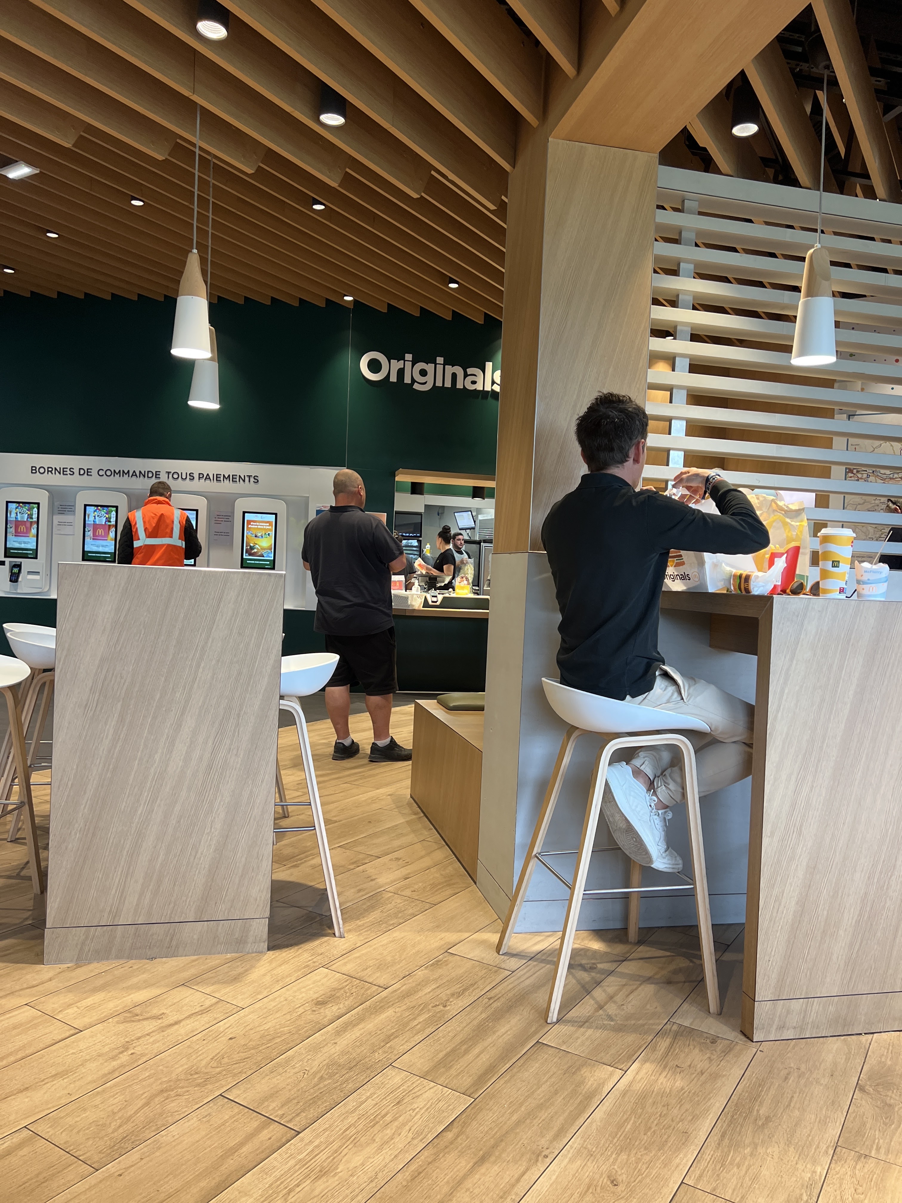 visité un Lundi. Points positif : -> Les toilettes étaient globalement propres. -> Les produits étaient bien faits et bons, avec une plutôt grande générosité dans la garniture du big mac. -> Je ne sais si c’était une erreur, mais nous avons reçu trois sauces creamy deluxe alors qu’on en avait payé qu’une seule, nous avons grandement apprécié. -> Leurs sundae étaient très bons et pas liquides à l’instar de beaucoup de mcdo en ville. Notre commande n’a pas eu d’oublis, ce qui nous a évité d’aller demander des produits oubliés et d’attendre avec notre commande qui aurait pu refroidir. Points négatif : -> Il n’y avait pas assez de place pour s’installer en heure de pointe. surtout avec les places disponibles autour du restaurant. -> Notre commande comprenait une erreur de burger. Ils ont préféré reprendre le burger malgré la proposition de le garder car on l’avait touché. Apparemment ils préfèrent jeter le sandwich plutôt que de nous le laisser. -> Il n’y avait pas de serviettes dans notre commande, pour une commande à emporter ça devrait être mis de base. -> Il n’y a pas beaucoup d’espaces ombragés, et trop peu de parasols sur les espaces complètement au soleil. Cela peut être dangereux pour les enfants, surtout en cette période de canicule. -> Il n’y a pas beaucoup de choix en terme de produits, pas de sandwich un minimum sophistiqué, mais le fait que ce soit un “mcdo originals” doit influencer sur le choix des produits. -> Pour un restaurant ayant ouvert récemment, avoir 2 bornes sur 6 Hors-service paraît problématique durant les heures de pointe, ce qui a entraîné à une plutôt longue attente.