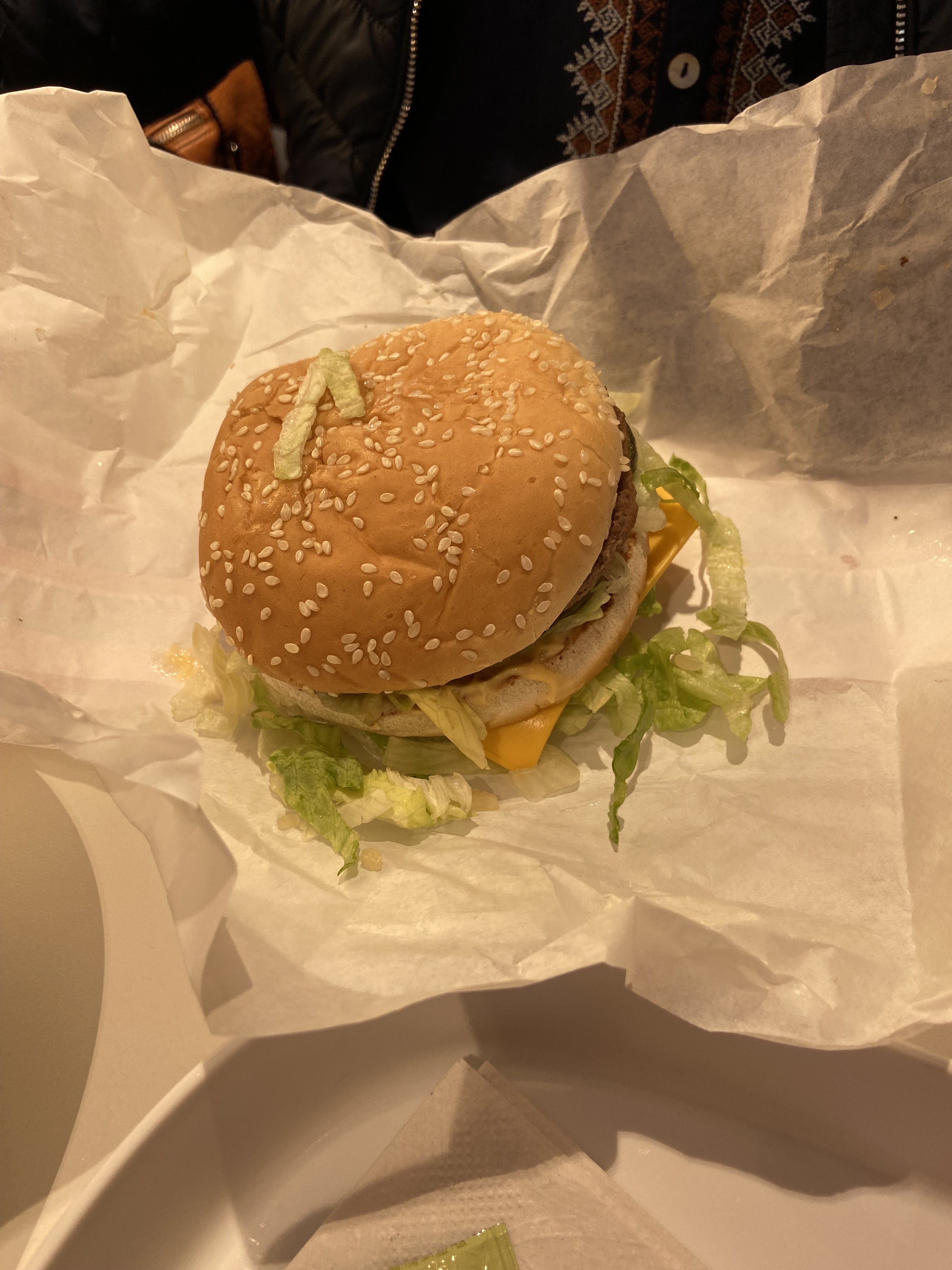 Menu Maxi Bic Mac commandé à emporter; arrivé à la maison : pas de fromage, pas de cornichons et un morceau de viande manquant ! Je décide de retourner changer le sandwich, un manager sans doute (habillé de noir), m'explique que personne n'a croqué dans le bout de viande. J'insiste pour qu'il me le change, ce qu'il fera de manière désinvolte et sans même une excuse. Il a également fallu que je 'réclame' des frites chaudes car celles-ci étaient sèches comme la justice... Ni sérieux, ni bon.