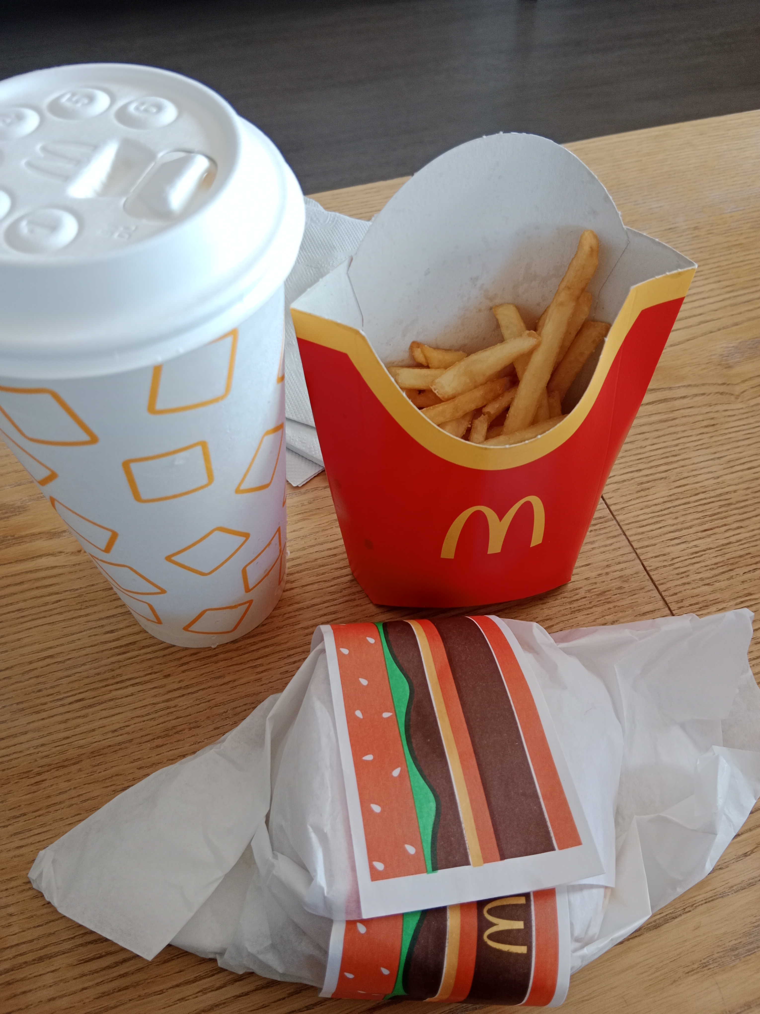 Un an que j'avais pas mis les pieds dans un mc do. Les nuggets semblent recuits, royal cheese et Deluxe bons et bien montés, rien à redire sir les frites. Par contre, le plateau est arrivé avec de la sauce bic mac et mon sachet de nuggets posé dessus. Plus d'emballage pour les verres c'est une bonne chose, mais on se retrouve avec de vraies verres pas très propre. Vu l'état du sol gras, on n'a pas envie de poser ses lèvres sur les verres.