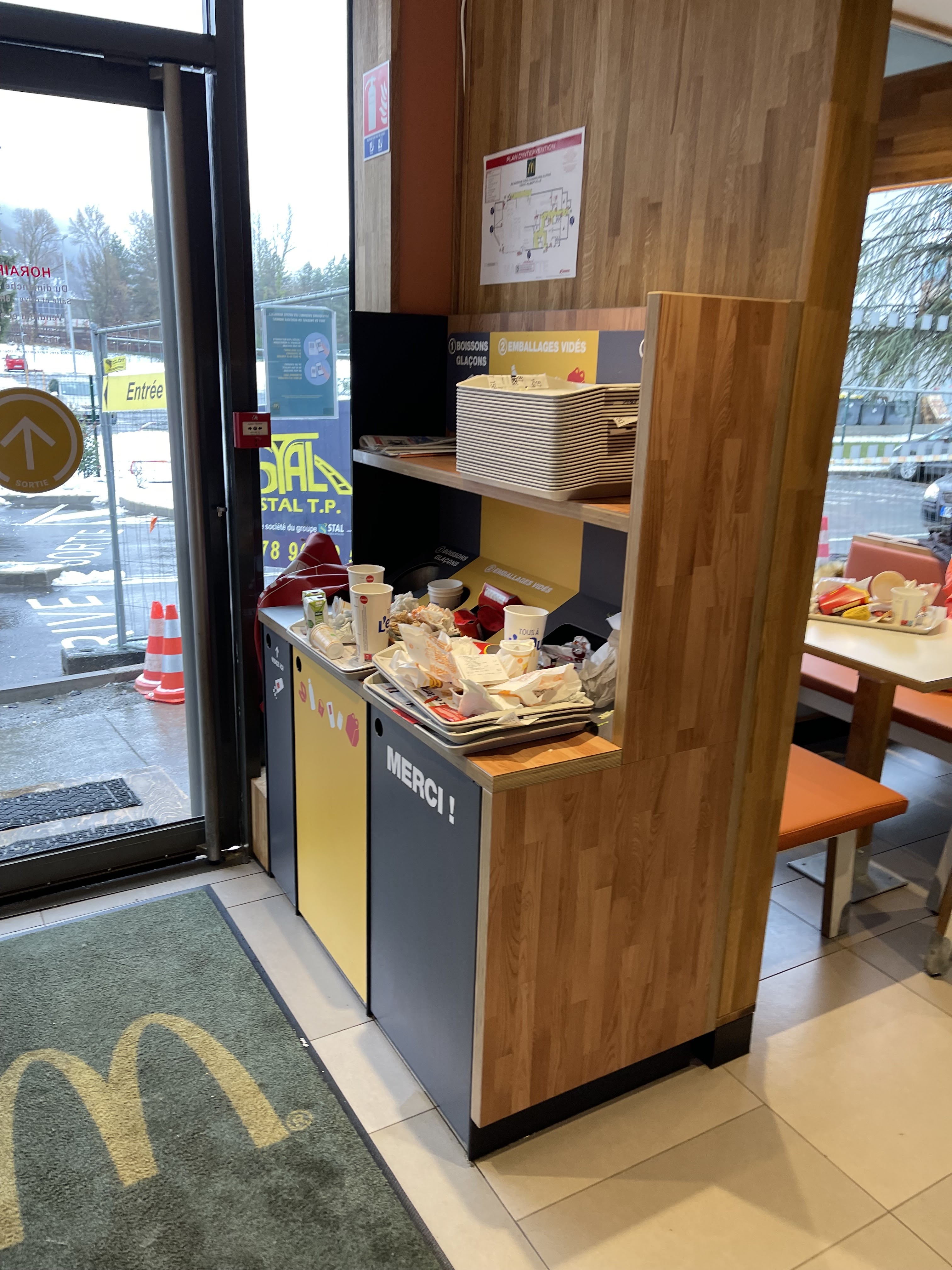 Séjour au ski du 3.01 au 9.01, passage à ce mcdo avec mes 3 enfants à l'aller et au retour. A l'aller déjà service catastrophique, 3 clients et attente de 20mins. Toilettes à 9.00 très, très sales, notifiée au personnel et expliqué pas la non réalisation par l'équipe du soir. le pire et était hier, 15 mins d'attente dehors (alors que le restaurant était à moitié plein) car manque de personnel non lié au covid. Les écrans des bornes avaient été divisées pas 2 pour pouvoir réguler la cuisine, pas de personnel en salle et donc poubelles débordantes, du coup plateaux non débarrés par les clients sur les tables, attente de la commande de 20mins, toilettes puantes, du jamais vue et inacceptable. j'espère que mcdo france va debarquer pour auditer. le franchisé ne doit rien comprendre et n'est surement pas un bon entrepreneur.