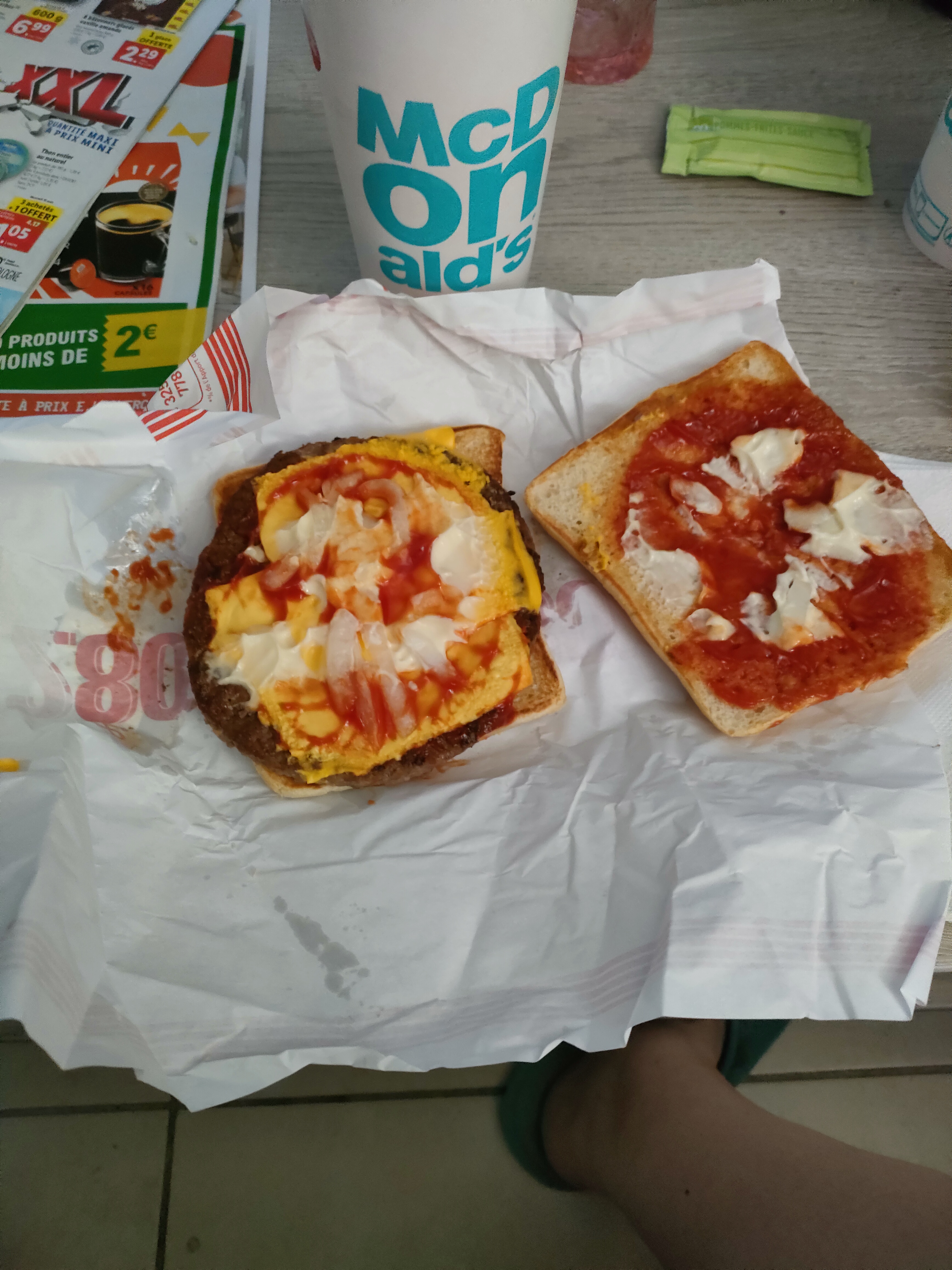 Si c’était pas mcdo personne irait, franchement les burger sont préparé les yeux fermé non? Les ognons sont collé sur le côté du steak, il y a plus de fromage sur l’emballage que sur le steak, un cornichon s’est fait la malle en dehors du burger. Ils oublient des sauces. Vraiment pas fou