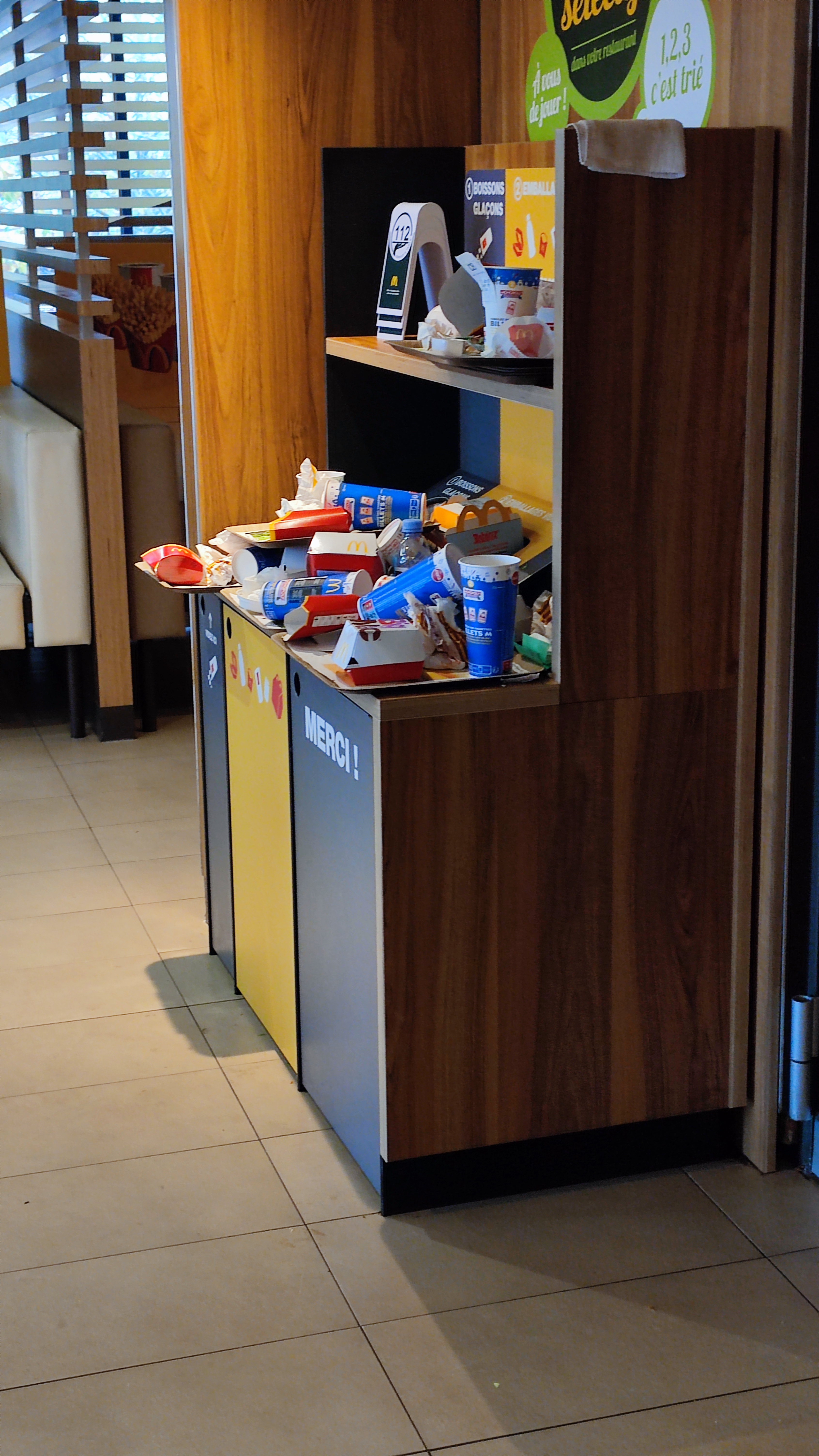 Difficile de trouver une place assise propre ce samedi 10 février au soir ! Il y avait de la fréquentation mais loin d'être complet.. Tables sales, et parfois non débarrassées, des déchets par terre et quand on voit l'état de la poubelle qui deborde on se pose de grosses questions sur la propreté et l'hygiène de ce lieu ! Ne parlons pas du sol glissant et gras !! A priori selon une autre cliente, les toilettes n'étaient pas mieux avec une chasse d'eau non fonctionnelle.. Mac Do, il serait temps de réagir pour ce lieu !!! Si la salle arrive à être dans un état pareil, on peut se poser de grosses questions sur l'hygiène de vos cuisines...