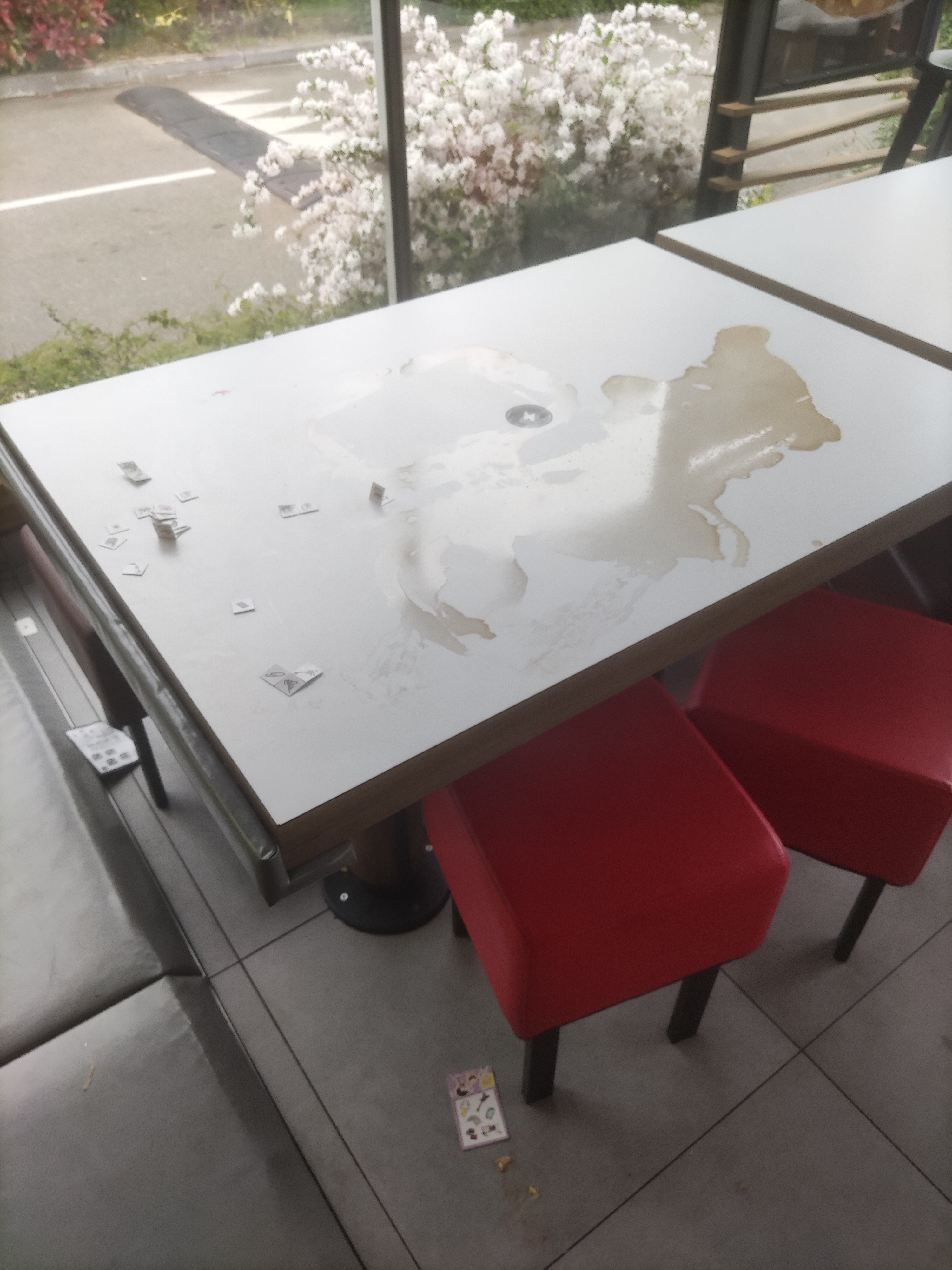 Pas de chevalets pour éviter de se bouger, tables sales, sol idem, lumières à moitié éteintes dans le restaurant, propreté du plateau reçu avec notre commande dessus LAMENTABLE. Même quand on informe qu'il faudrait qu'une personne nettoie le restaurant, personne bouge.