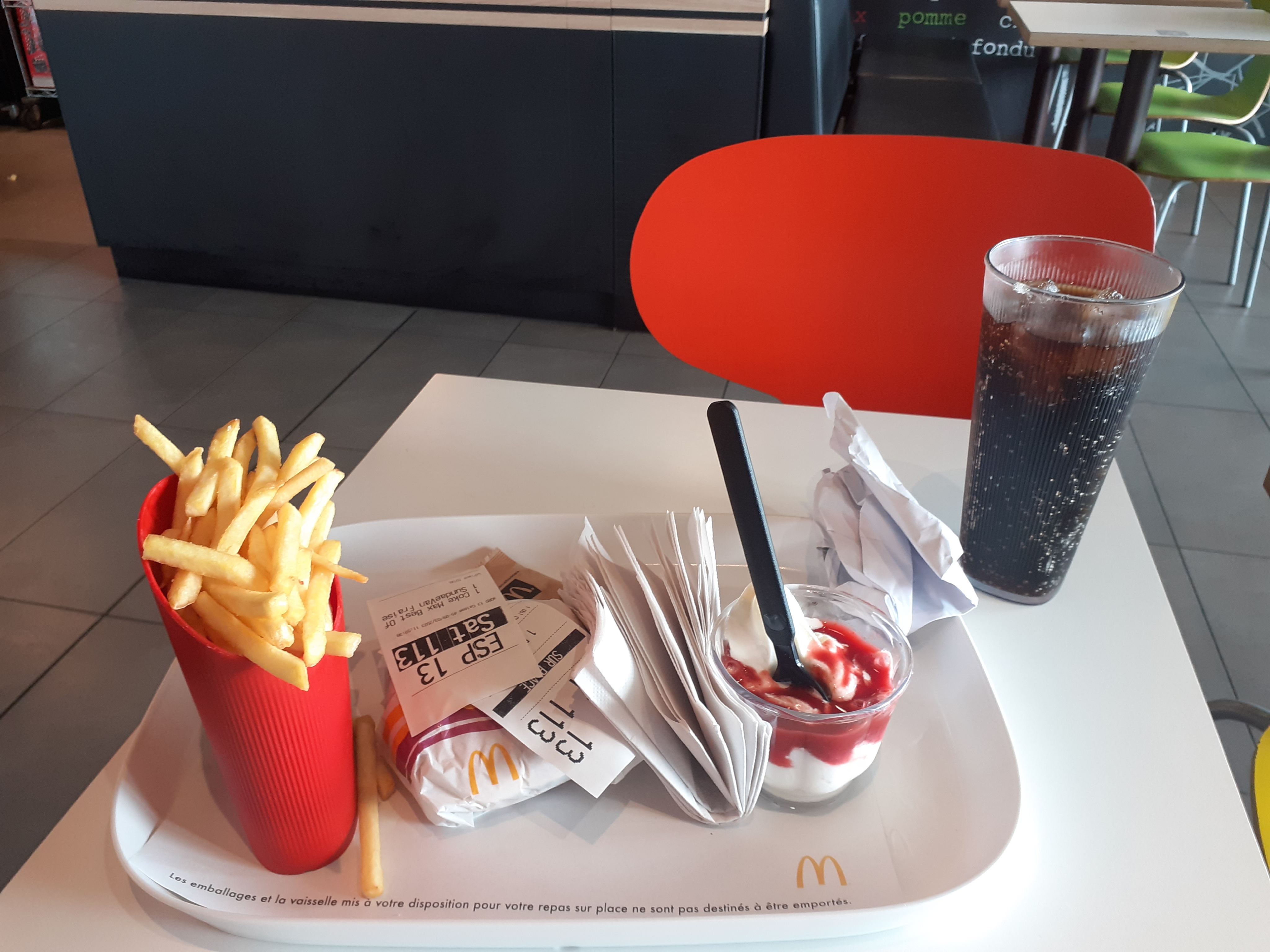 Contrairement au McDo de ma région ( Bretagne) il faut débarrasser la table . Celle ci manquait d'ailleurs de propreté sinon cela reste un mc do classique . Les mc flurry sont petits chez nous le verre est rempli la ça arrive à peine a la moitié