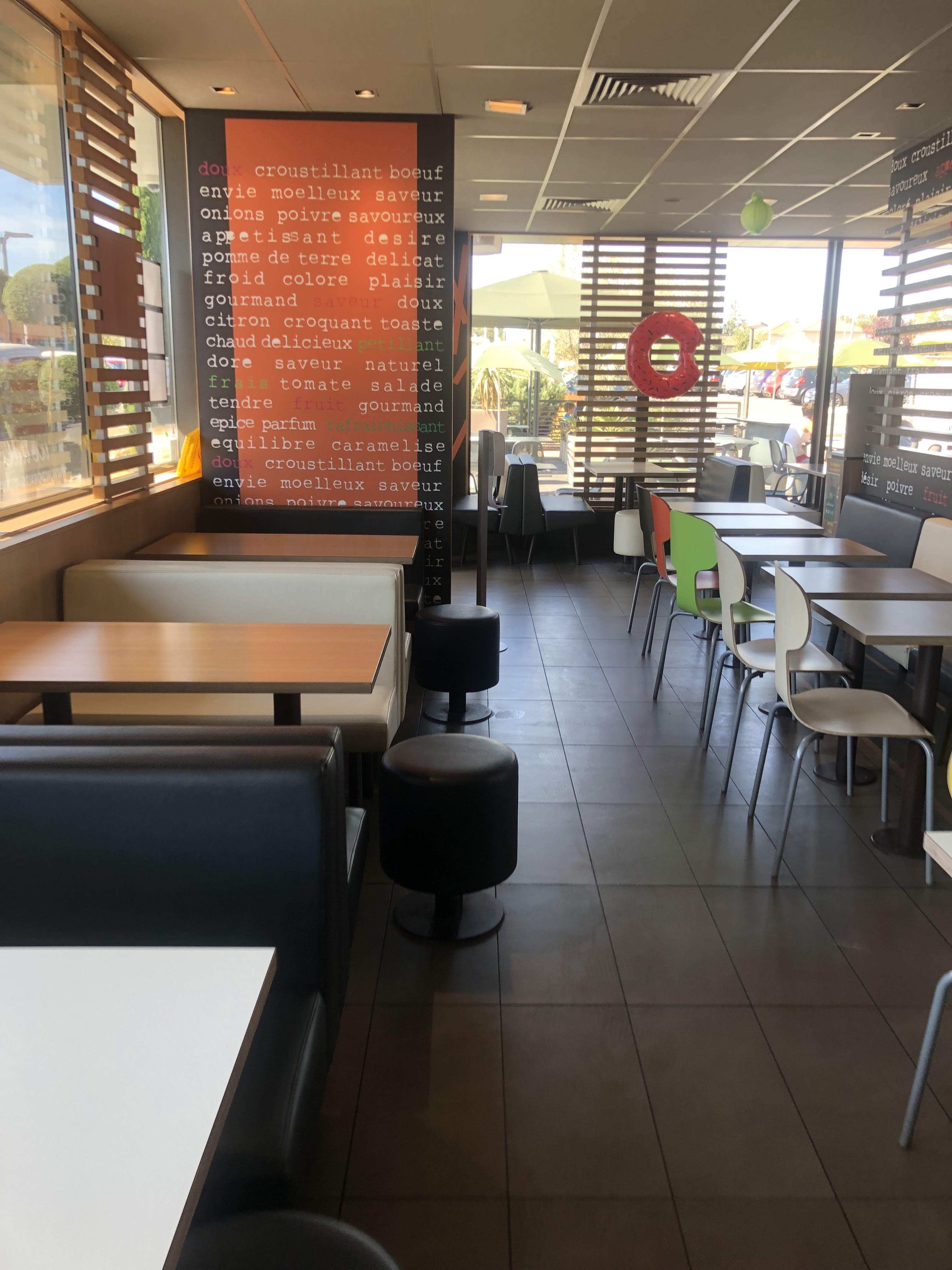 Mc do très sale, certes en plein jour de retour de vacances mais ceci n'excuse pas tout. A 14h30, sol sale, du liquide glissant partout, WC immondes, tables non nettoyées..... Et en plus tu commandes un doonut nature, on te refourgue un au glaçage sans te prévenir . Quand tu vas leur dire on te répond: ben y a plus que ça ! oui d'accord mais demandez , prévenez le client et sinon remboursez! Sinon cela s'appelle de la vente forcée ! La prochaine fois , nous ferons quelques km en plus.....
