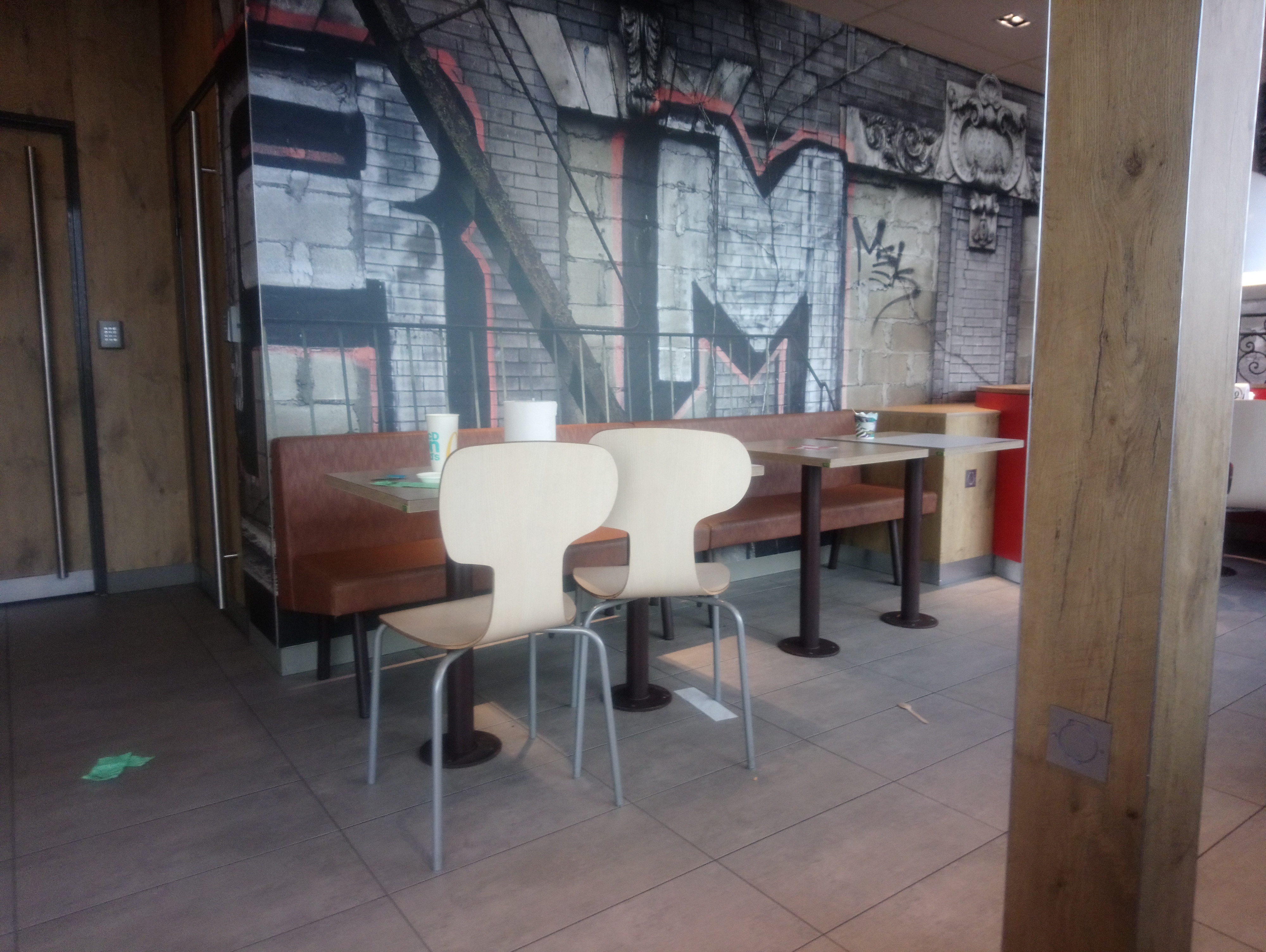 Services RAS Par contre restaurant sale que se soit les tables et le sol une hécatombe !!!! Les chaises On ne savait pas ou s assoir. Je trouve ça honteux de devoir manger sur du sale Je le déconseille fortement C est bien la première fois que je tombe sur un Mac do comme ça Beuk