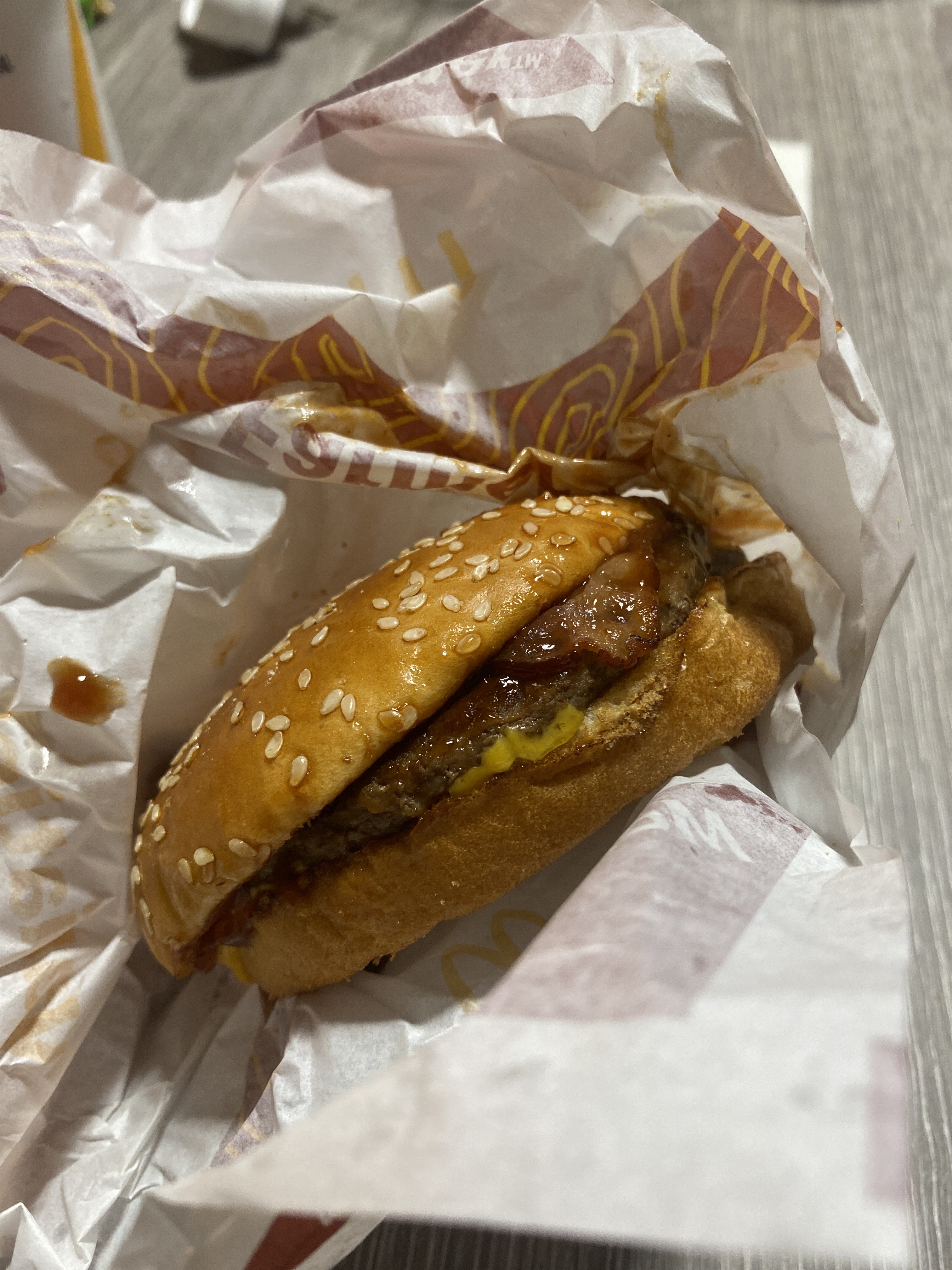Burger qui ne correspond pas du tout à la description ! Je prends le mc rancher normalement 2 steaks à l’intérieur et bah là non …