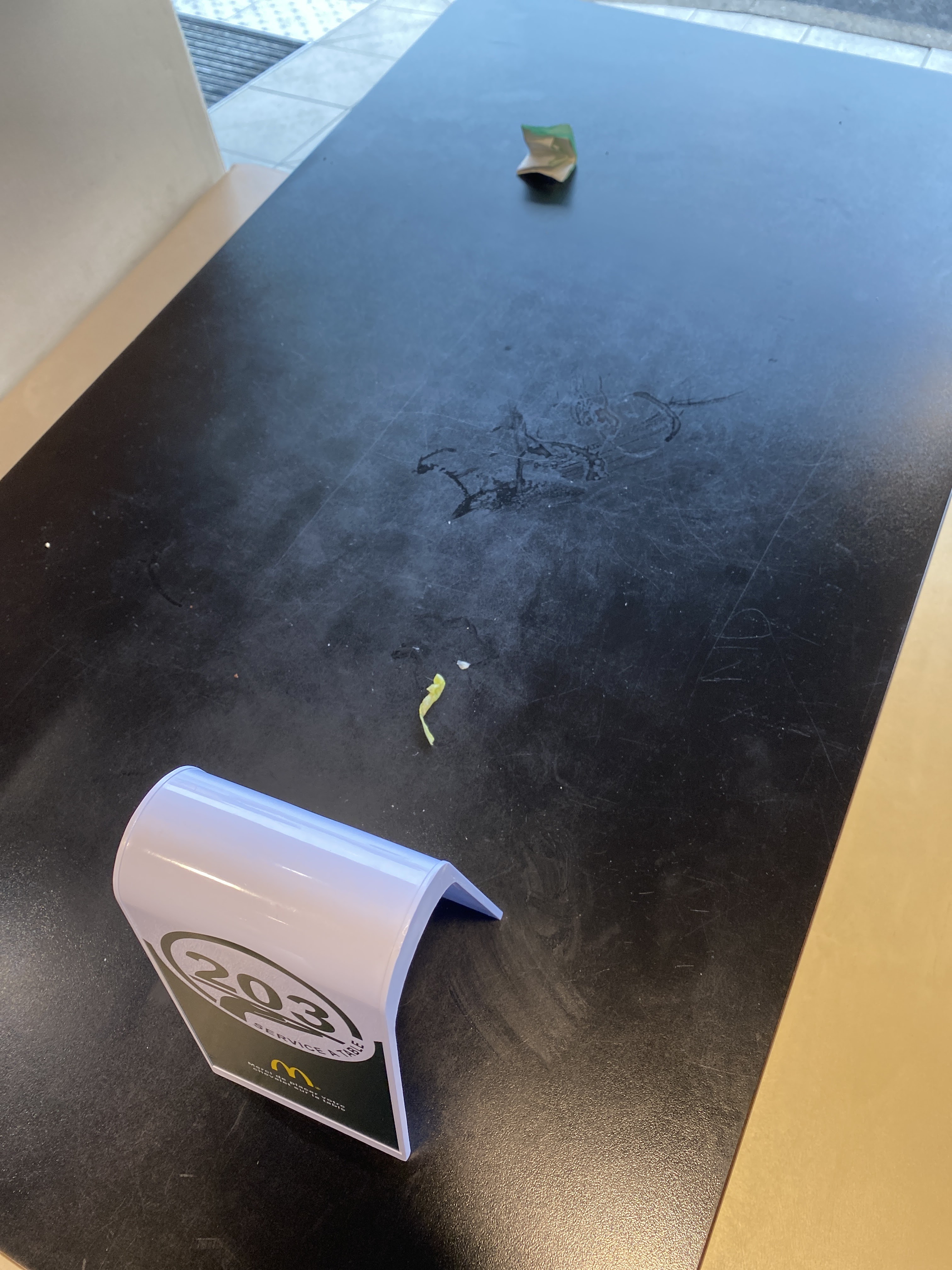 Des tables dans un état décevant, toute grasse et pleine de miettes. Nous avons chercher à travers tout le macdo pour trouver une table non sale. Et ne parlons même pas du sol. Sinon service rapide, pas de sauce frite, pas d’eau pétillante au citron. Enfin bref pas le meilleur.
