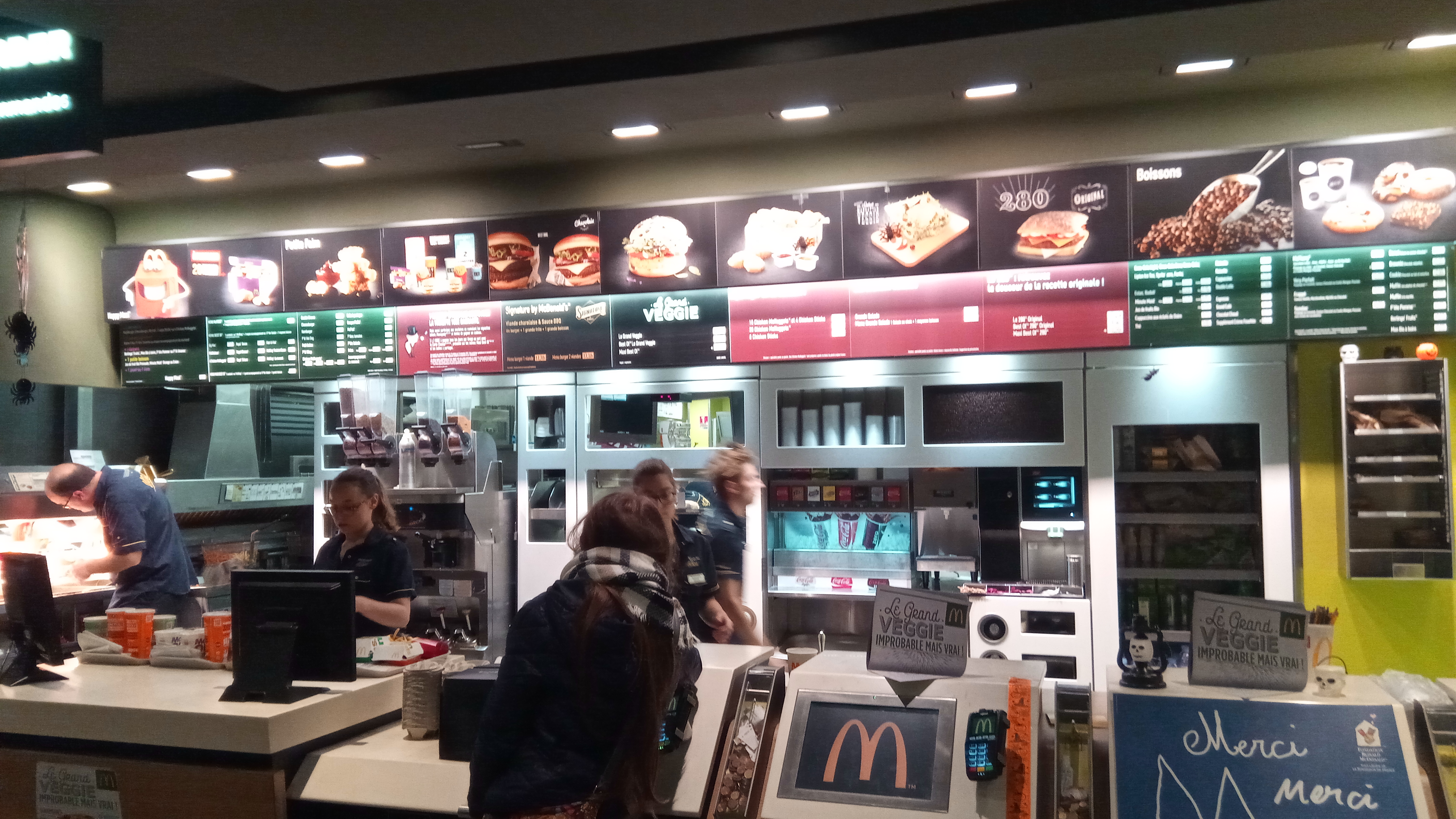 U e dizaine d'automates pour passer commande. Seuls 2 ou 3 fonctionnent. C'était mieux avec des humains à la prise de commande. La queue était moins longue et en us il y avait un vrai contact.