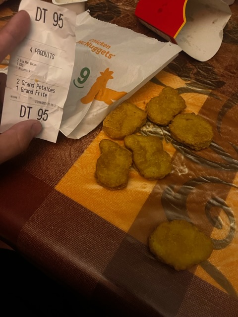Je reviens du drive. J'ai commandé un maxi best off Big Mac, qui n'a plus rien de Big et des frites au fromage. Dans la boite il y a quatre frites qui se battent en duel. Je suis dégoutée !