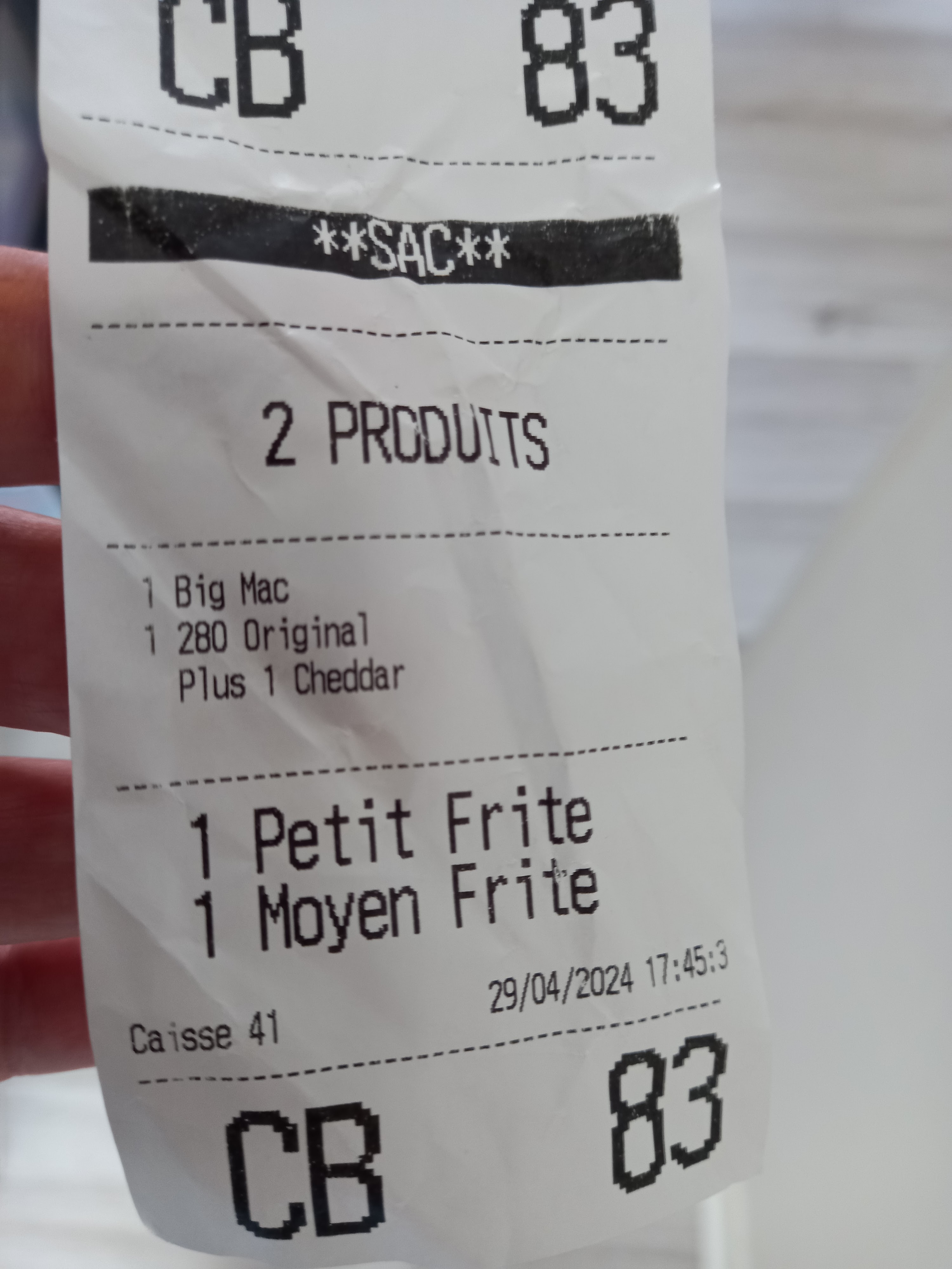 Commande cb98 a emporter du vendredi 8/09/2023 commande d'un mac eggs muffin le pain était noir sur les bord et goût de cramer , potatoes écraser au fond du sachet comme si il avait été pressé a la main , commande d'une boissons a la fraise et j'ai eu de l'eau. Seul le 280 était correct vraiment déçu c'était ma dernière visite dans ce mc do !