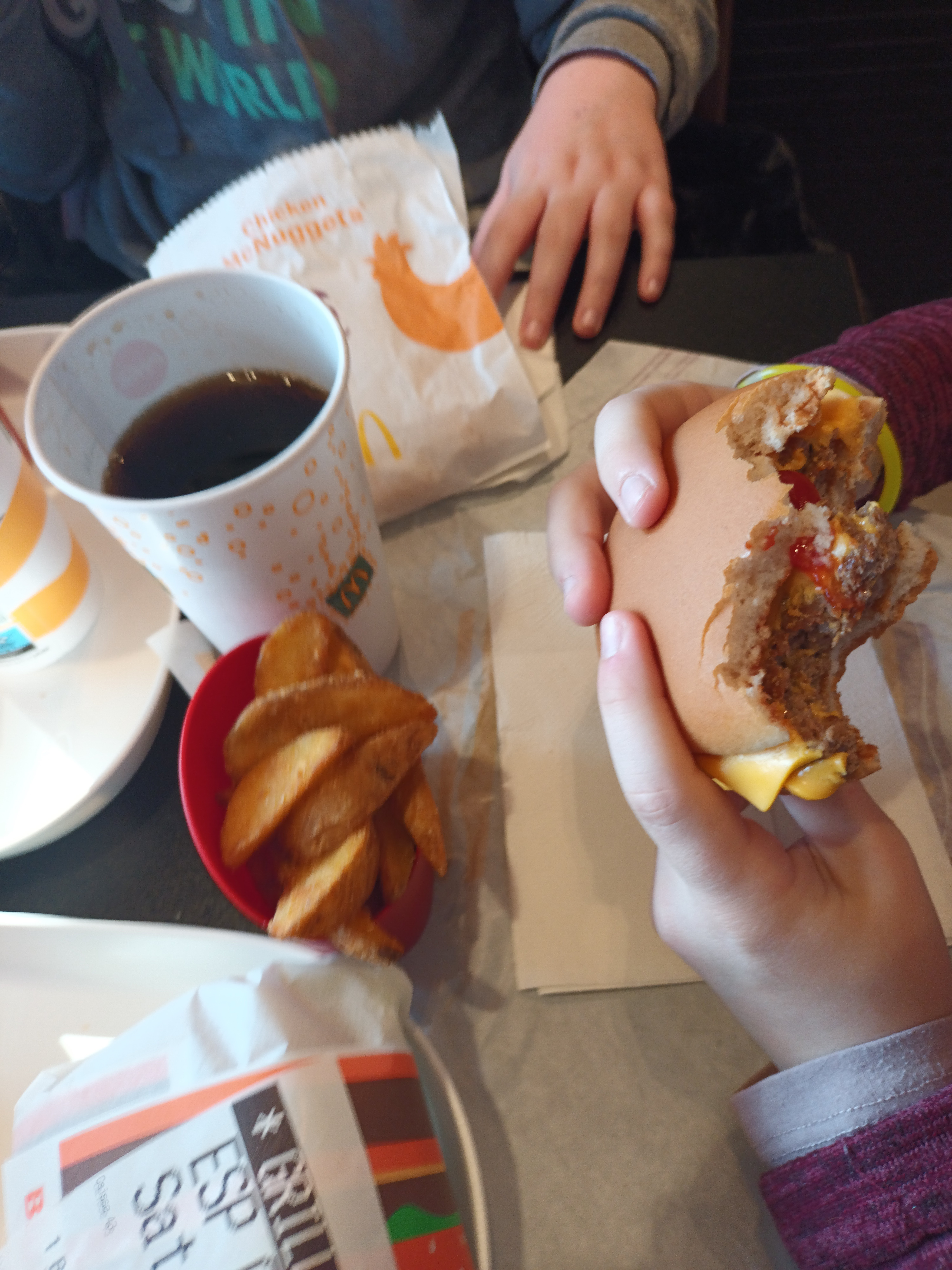 Mc do désert un mardi soir, pas débordé mais pourtant table et sol sales, plateau repas salé, trace de rouge à lèvre sur les verres, big tasty froid…. Les poubelles débordent, responsable ne se déplace pas.