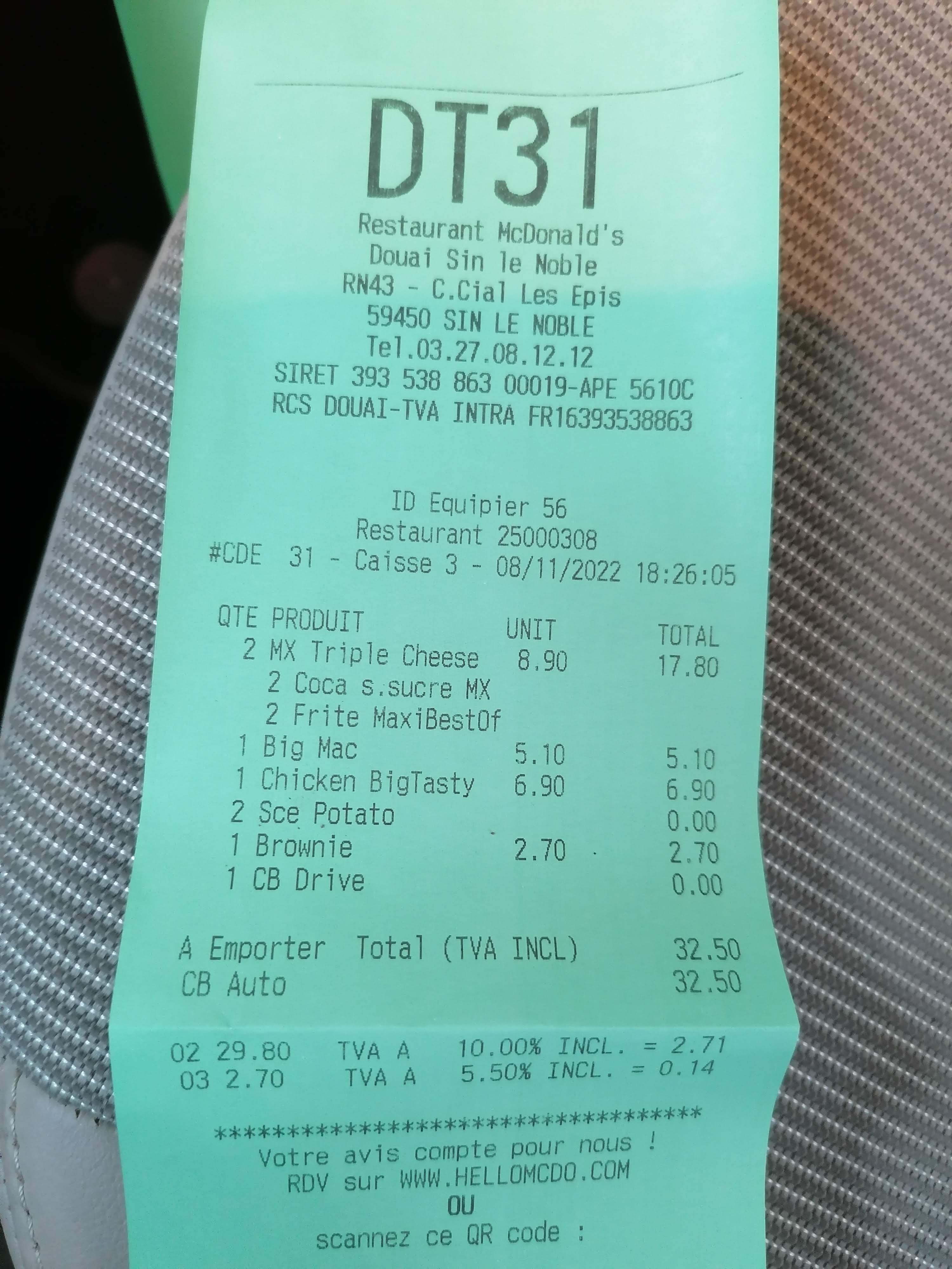 Par quoi commencer...lol Une grosse impression de restaurant sale en salle. 20 25 min pour la préparation de restauration rapide Je récupère mon plateau, froid. Hamburgers et potatos Je demande un changement, que je récupère rapidement chaud Mais sur un plateau avec des traces de ketchup et des traces noires non identifiés Je me pose vraiment la question sur les procédures de nettoyage de la vaisselles réutilisable Et que dire de la pauvre demoiselle en salle qui se prend un nombre incalculable de réflexion sur le restaurant, courage à elle (service du 7 fevrier à 15h30) elle garde calme et politesse Je rajoute pour la responsable internet de chez Mac do (en date du 23 février), vous me demandez de vous faire copie par mail de cet avis, chose que j ai fait le jour même de votre réponse. Vous allez sans doute me répondre que vous n'avez rien reçu, mais je n'ai à ce jour reçu aucune réponse de votre part. Je pense que votre sérieux est comparable à votre restaurant.