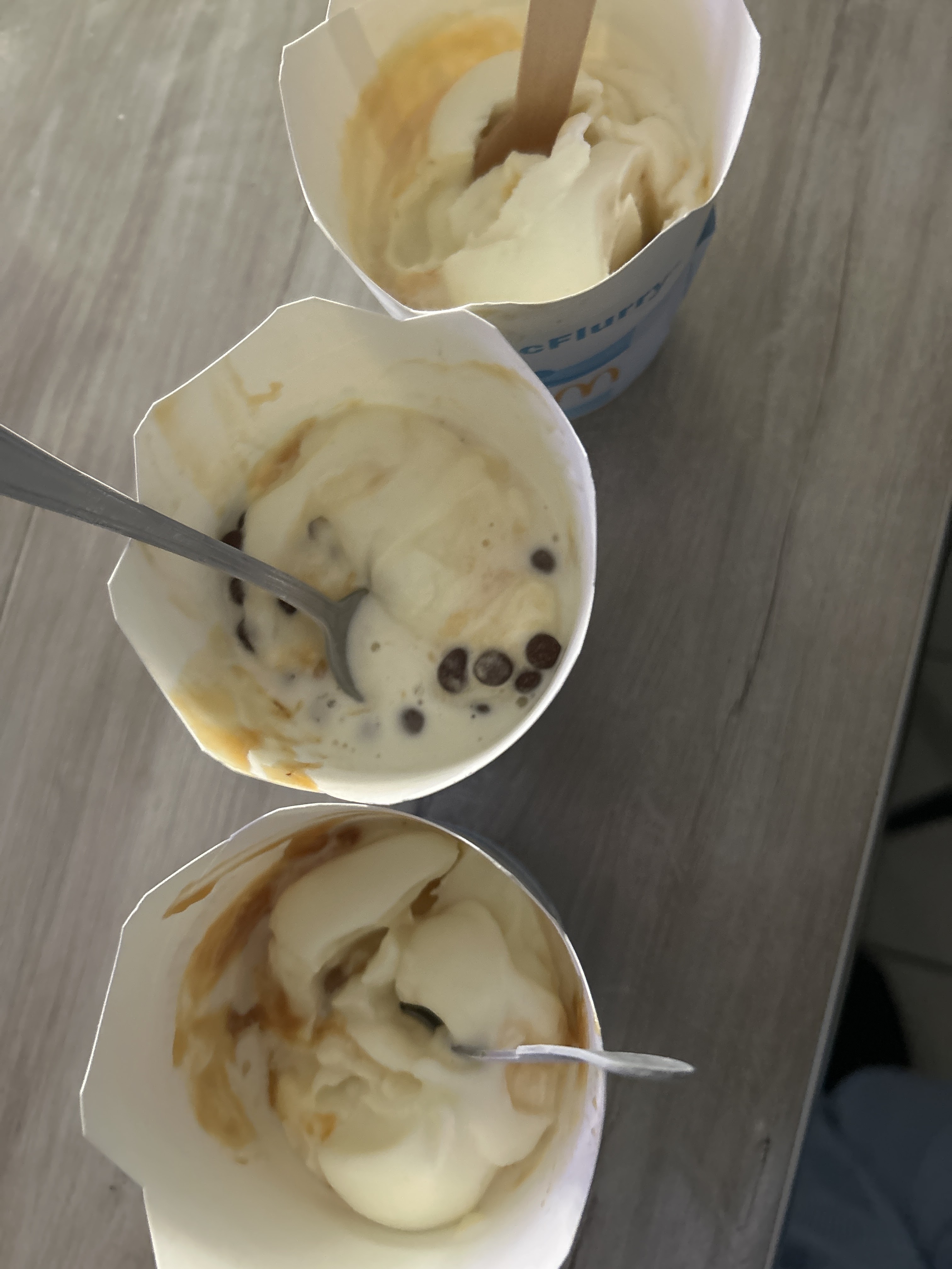 Nous avons pris 2 Mcflurry m&m au drive mon fils et moi. Les pots étaient à moitié rempli,donc je le signal, (4€40 quand même la glace) on me dit qu'on fait le nécessaire pour changer la commande. Je récupère la commande en espérant avant gain de cause. Et arrivée à la maison surprise les pots étaient tjrs rempli à moitié ils ont juste rempli les pots avec beaucoup beaucoup de m&m. Très déçu.