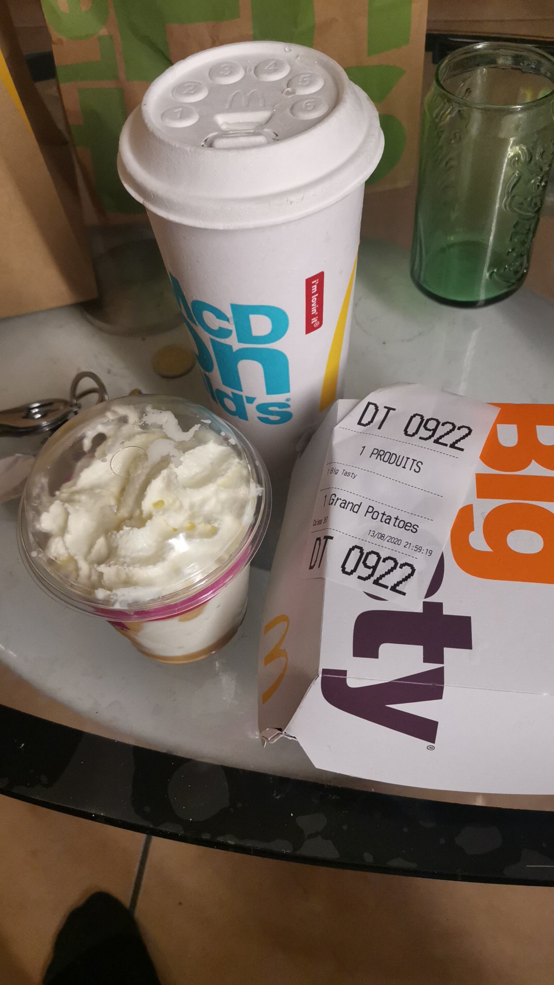 Voici ma commande, commandée sur le net et payée en ligne ! Un menu big tasty sans frites oubliées, pas de sauce et pas de serviettes et encore ils avaient oublié la glace ! En arrivant à la maison je me rend compte pour la frite incroyable d'oublier autant de choses
