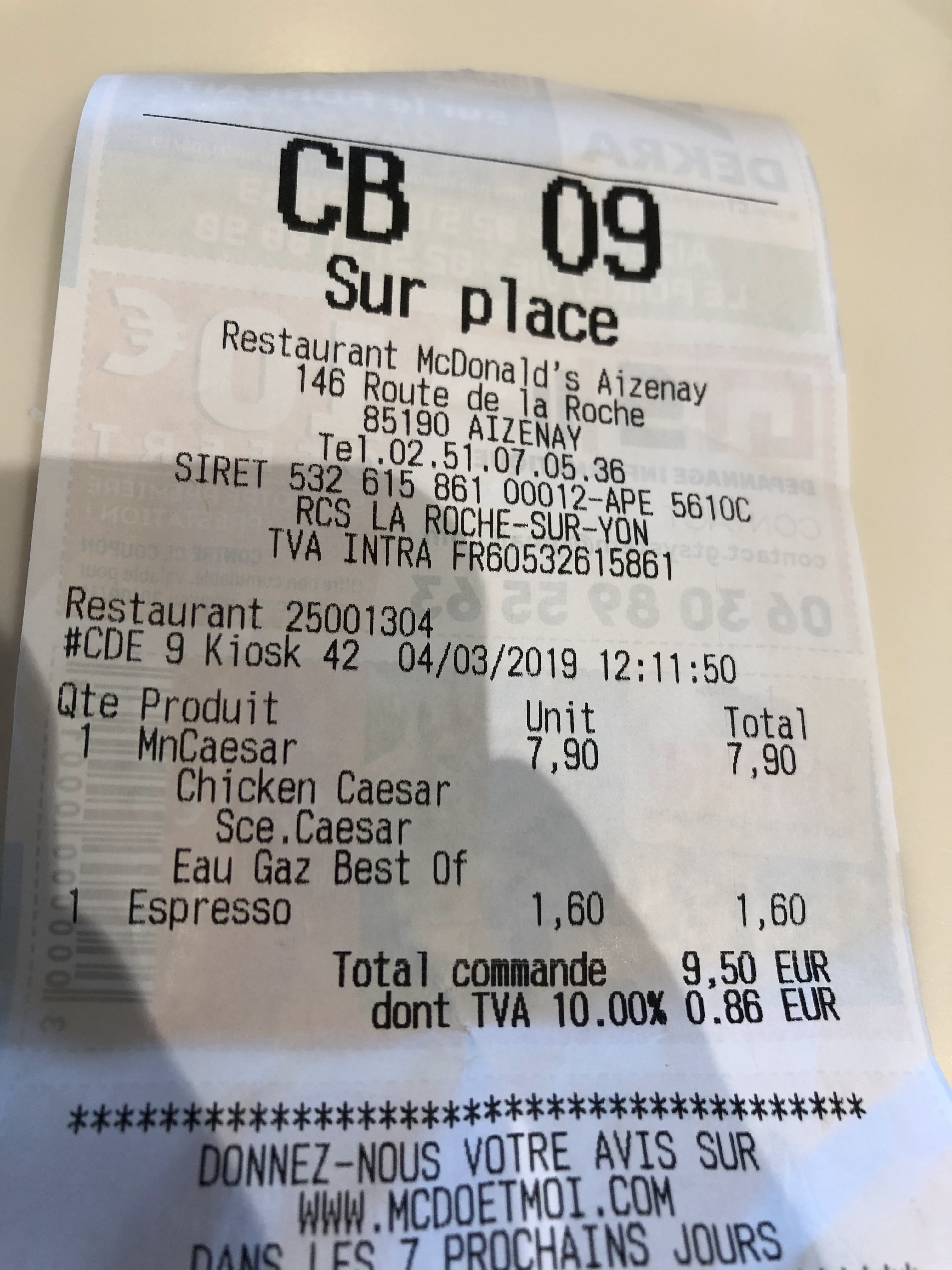 Bonsoir, Nous avons extrêmement surpris, après une attente interminable de plus de 45 min en click and collect. Après avoir vérifié notre commande sur place, dans l’attente de manger notre repas. Nous avons reçu un nouveau produit le 280 sans steak. Une nouvelle formule à ne surtout pas louper au Mac donalds d’aizenay. N’hésiter surtout pas à bien vérifier votre commande et de déballer votre produit pour ne plus être surpris.