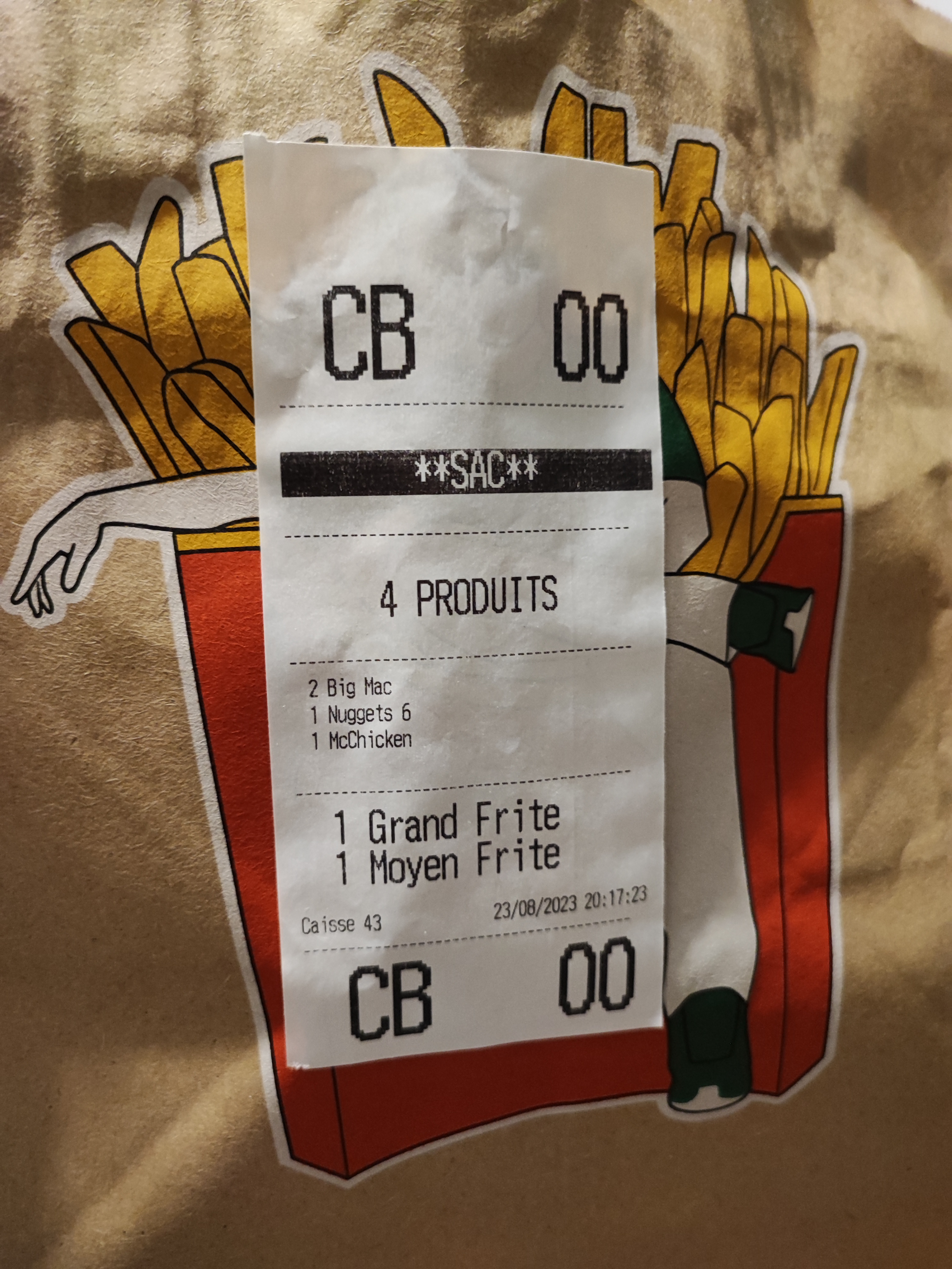 En commande via McDo + ou via l'intermédiaire d'UBER EATS, commande reçue froide, commande incomplète, boissons renversé, commande annulée pour raison X, PAS DE SAUCE. Le but de commander c'est de ne rien avoir à faire, et là on doit quand même faire chauffer un four pour réchauffer nos burgers/frites