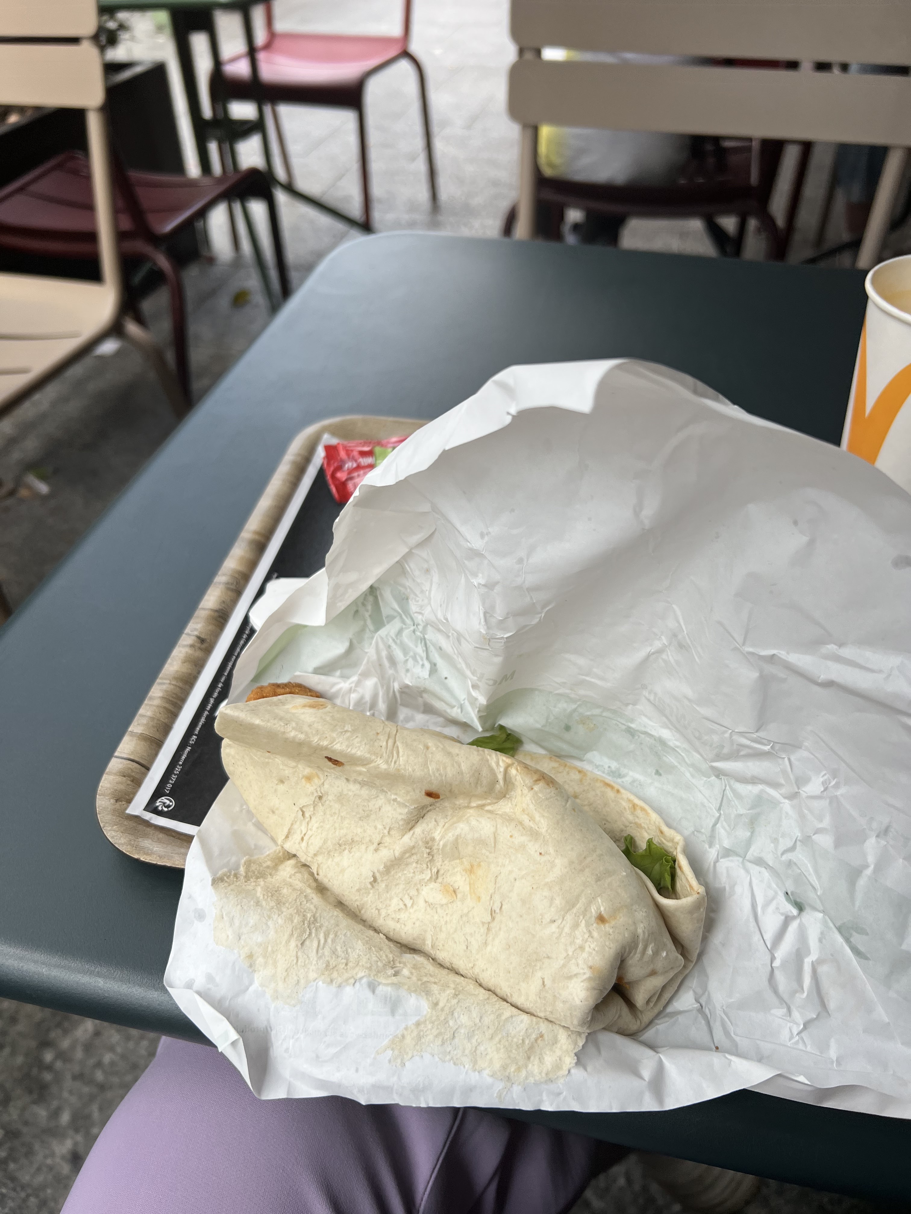 Présentation de mon wrap😭 un peu déçu Je le trouve aussi fade, avant il y avait beaucoup plus de goût dans les plats mais la🙅 Mes potatoes étaient un peu froid... Ca faisait un moment que j'étais pas venu manger au macdo, je suis un peu déçu Et j'aime pas trop ce truc de mettre l'eau dans des gobelets en carton 😭 mais bon c'est les nouvelles loi