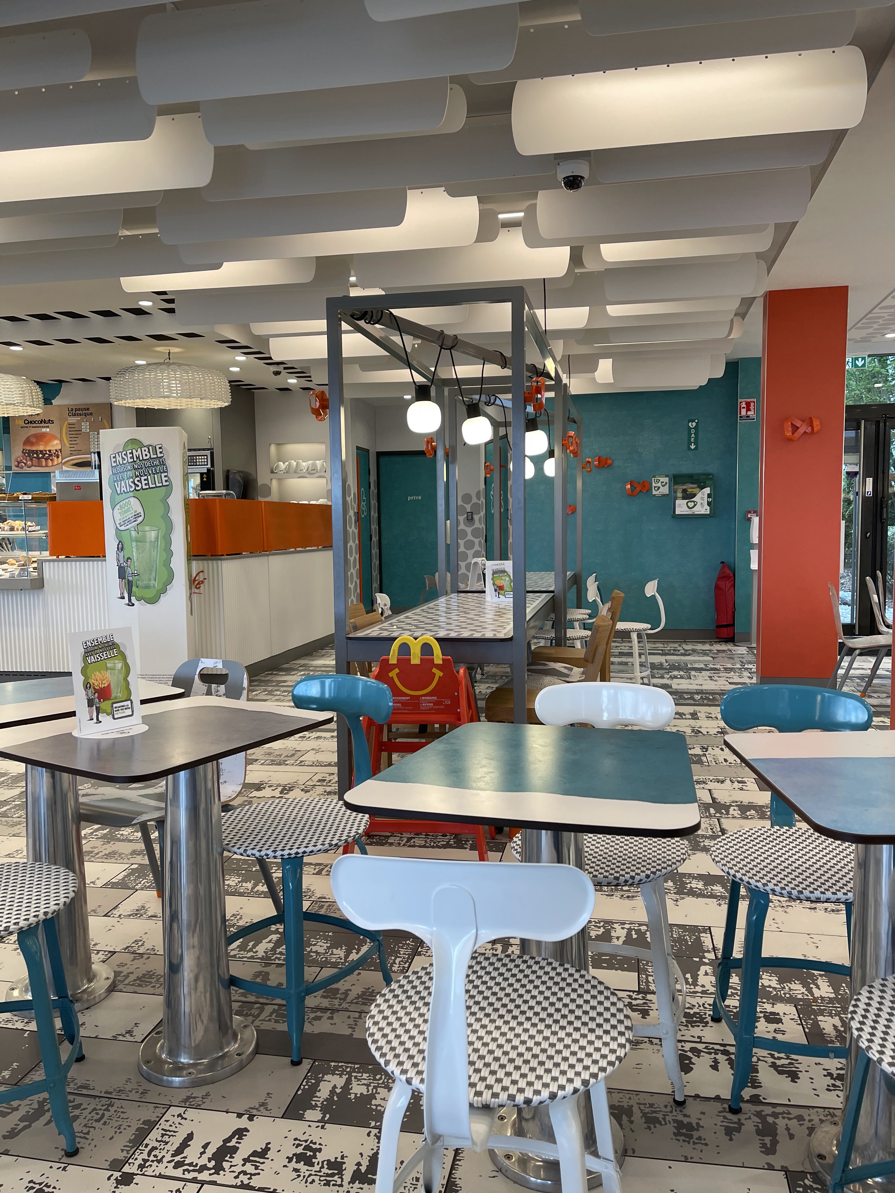 Très très beau. Ca change totalement du décors des macdo que j'ai pu voir. Produit très bon. Malgré un oublié, il nous on vite redonner ce qu'il manquait. Très souriant et serviable. Toute la vaisselle était lavable aussi. C'est top.