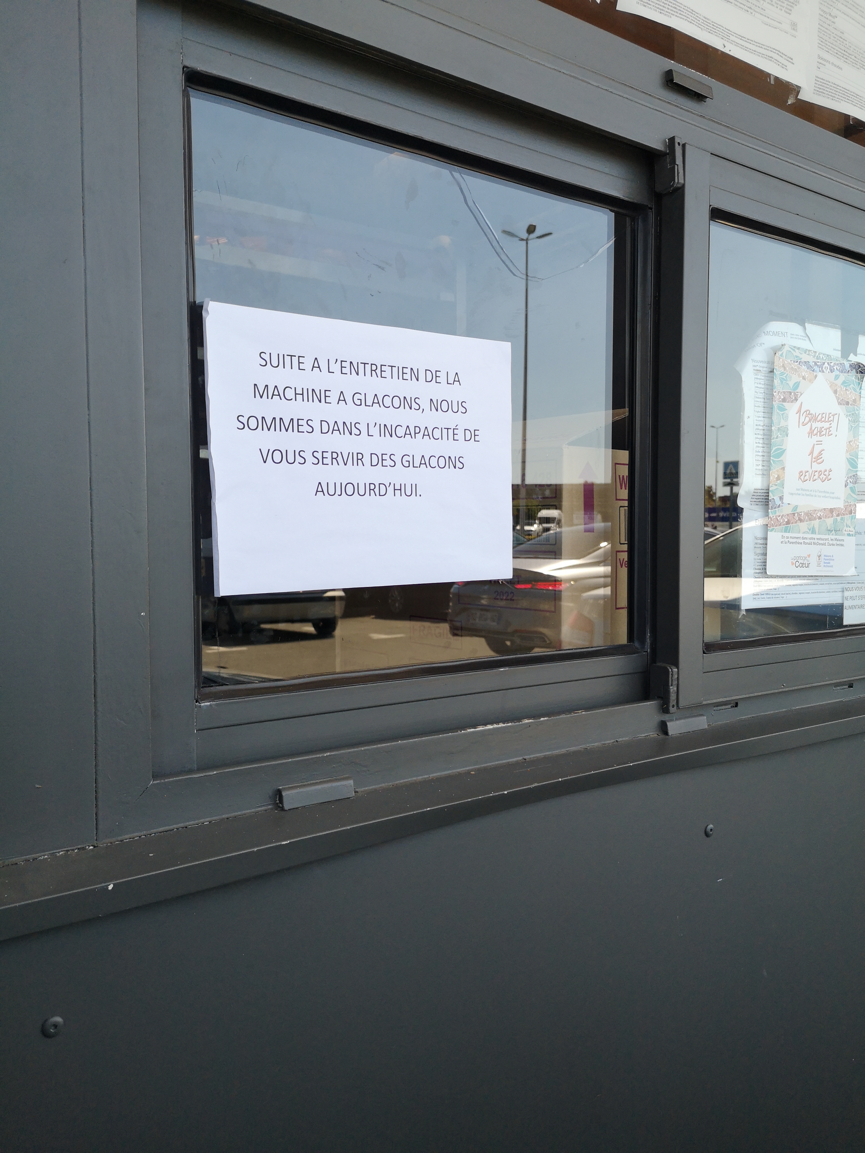 Alors cette fois-ci, je crois que nous allons vraiment changer de fast food... Soir de match = pas de client en salle, pas de mise en place en cuisine, mais tables pas propres pour autant. Servis plutôt pas chaud car à peine tiède, frites sèches et ne parlons pas de la fameuse vaisselle faite pour éviter tous les emballages : plateaux sans papier au fond pour l'1 et du coup sale et pour l'autre, le papier cachait la saleté. Les verres avaient des traces de bouche et j'aimerais savoir le poids d'une portion de frites ou de potatoes dans la vaisselle lavable comparée à une poche papier/carton. Et le clou du repas, la quantité de glace du mc flury était environ à la moitié du pot, des radins de glace on en a eu mais là, payer 4€ pour un fond de pot c'est le pompon !