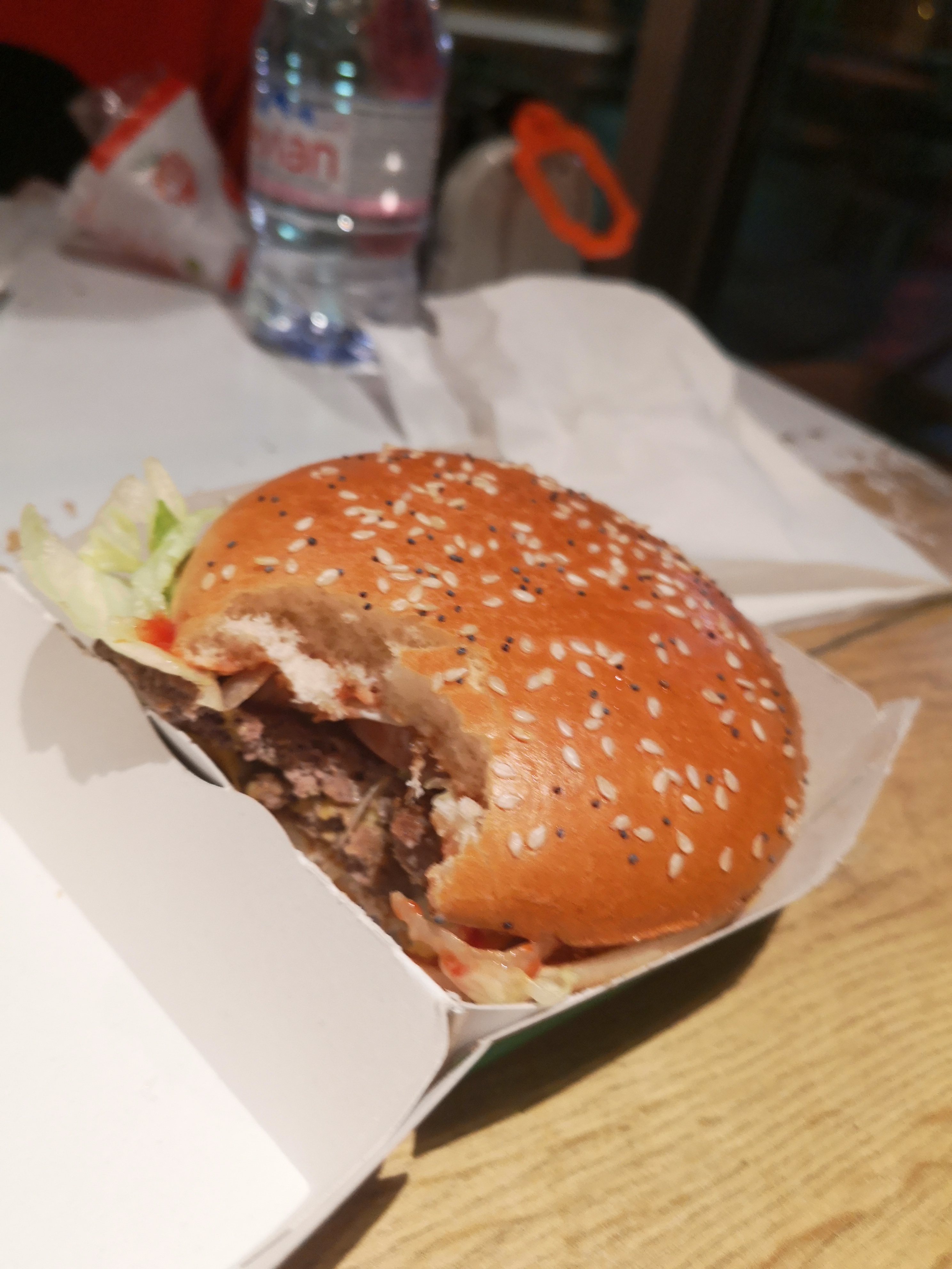 Arrivée à 22h15, il y avait très peu de monde et pourtant j ai cru rentrer dans une porcherie !! Mauvaise odeur, toutes les tables étaient très sales. Bref j ai préféré manger dans la voiture. J en ai fait des mac do mais alors là je n avais jamais vu ça !!! Une horreur!