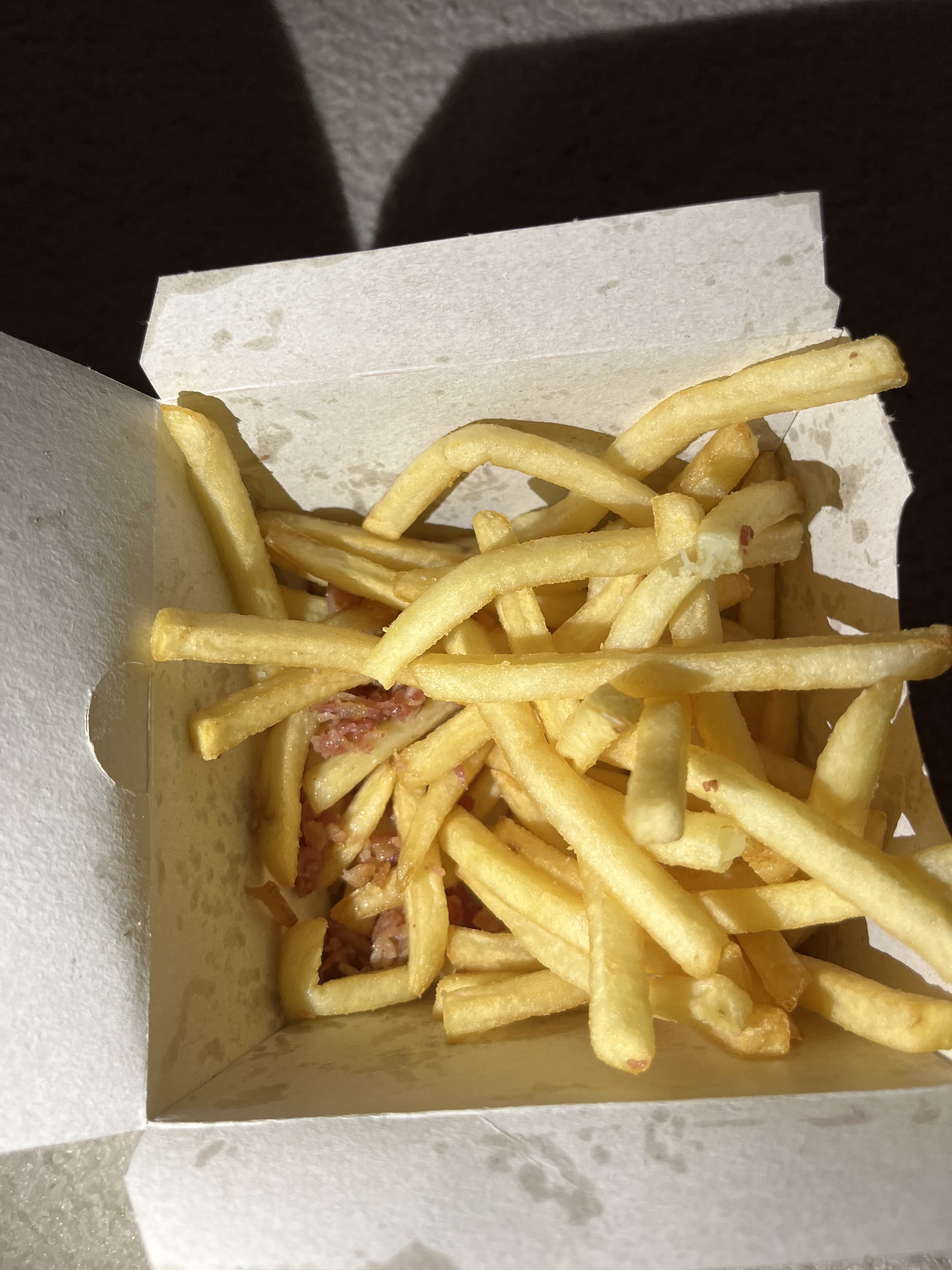 Franchement horrible frites congelé. J'Commence vraiment a me poser des questions, ya 10 personnes qui se court après donc je comprend pas. Pas de sauce ni serviette, bref commence dab.