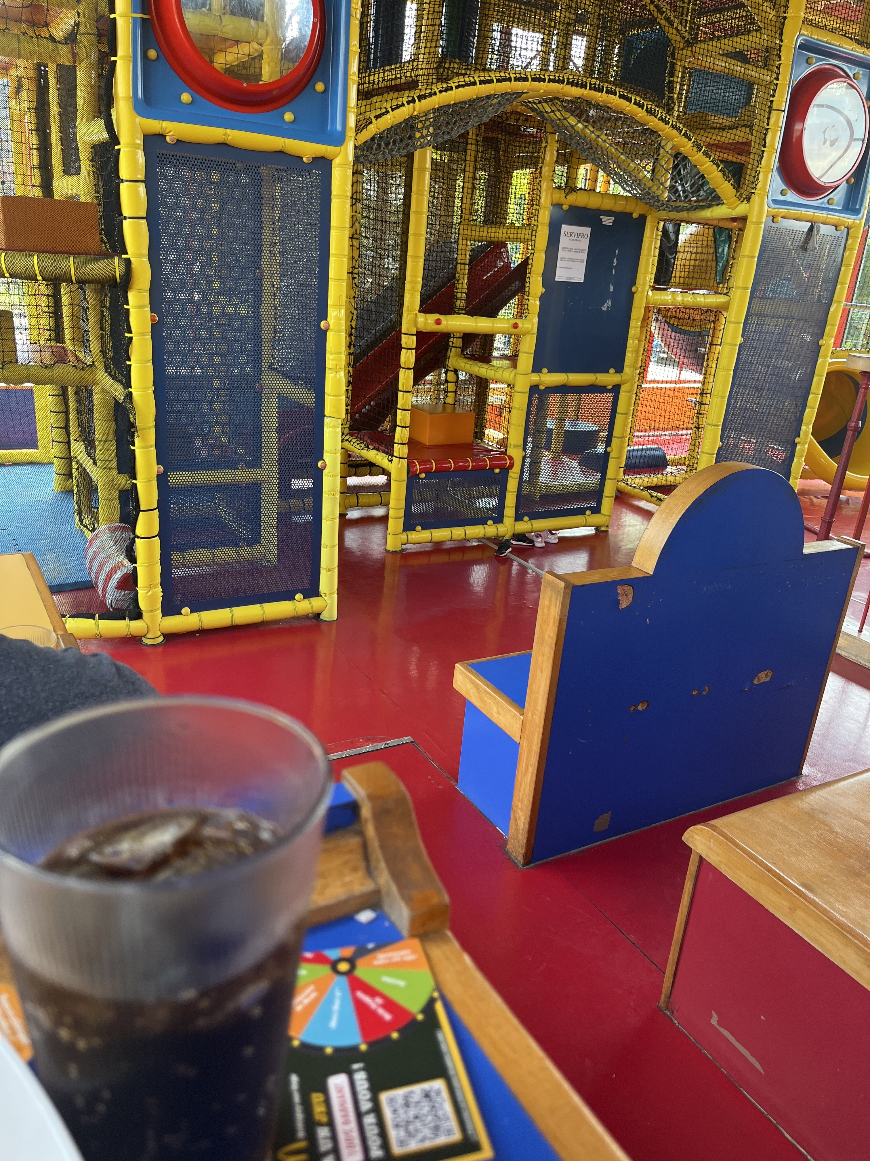 Un peu bondé, le service était assez rapide et la nourriture était chaude 😊 Les enfants ont adoré l'aire de jeux