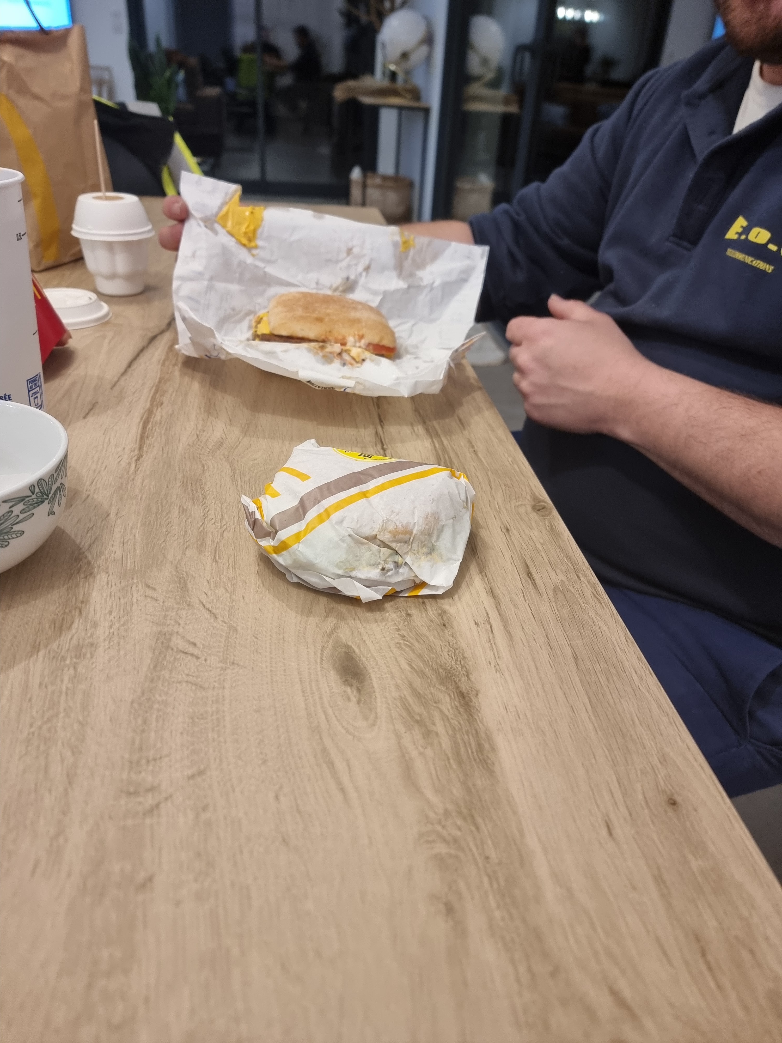 Très très déçue de notre repas hier soir D abord le egg muffin était noir à l intérieur Temps d attente entre les sandwichs et le reste de la commande. Pas de serviette ,pas de jeu qui fait partie du menu enfant Très mauvaise préparation des commandes. Dialogue dans l équipe????? Obligé d aller voir le personnel à deux reprises...... Les WC n en parlons pas