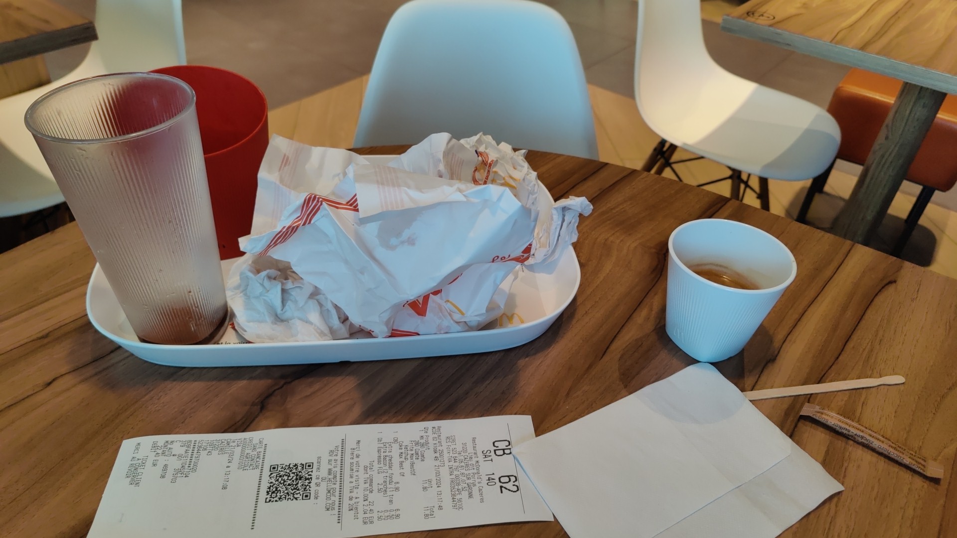 Comment vous dire ??? On est passé à de la vaisselle pour réduire les emballages, c'est un bon point. Mais du coup, impossible de partir avec les boissons. Et puis les wavy fries... Elles sont bonnes, encore faut-il qu'il y en ai suffisamment dans le pack moyen... Le mien était plein à moitié de graillons ! Enfin, les mini Apple pies par 3, bien que mis en avant étaient aux abonnés absents. Pas le temps de râler, car en transit mais c'est bien dommage tout ça 😕 un point positif, le personnel est vraiment sympa 🙏