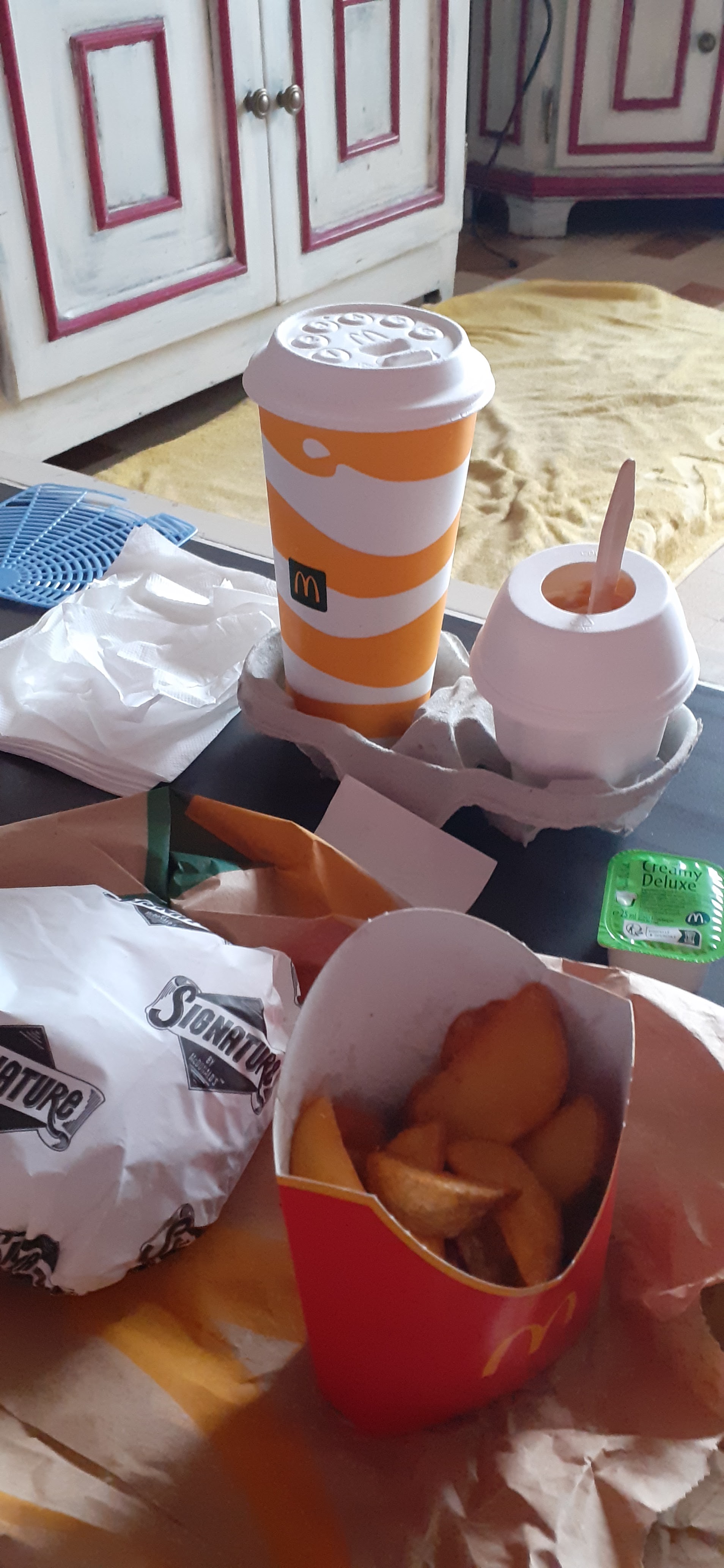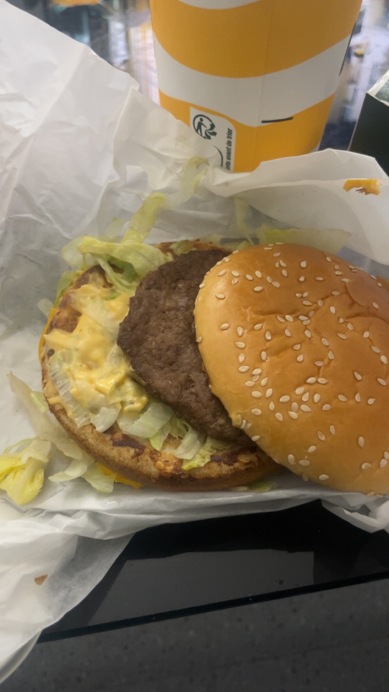 Pause déjeuner en rentrant de vacances. 1er contact avec ce Mc Do : sol glissant, hyper gras !! On choisit des menus et commande à emporter : résultat = pas de serviettes fournies + une boisson manquante !!! Donc très bof.