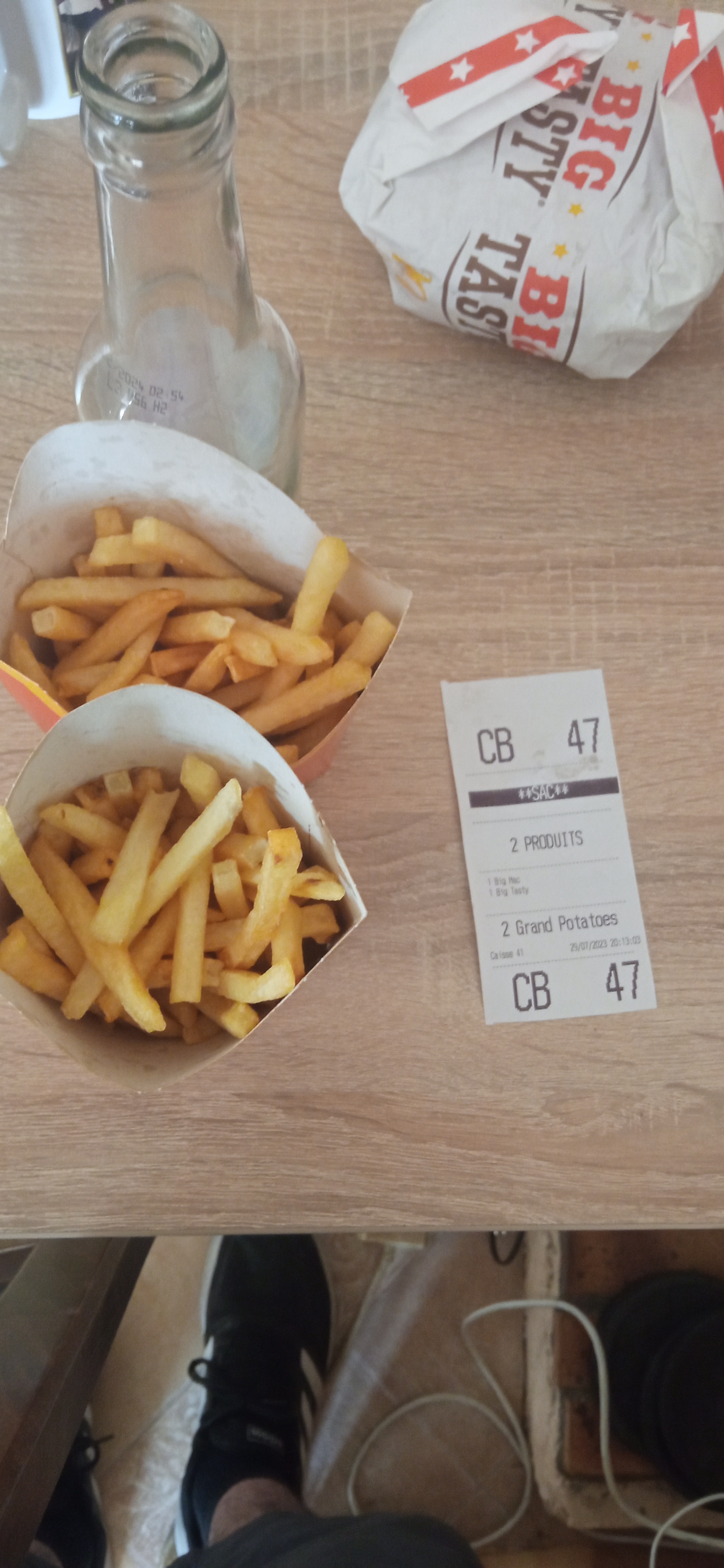 Re merci d etre dsl !!! Jeudi dernier 12h voila encorece que j ai acheter voir photos ... Grande frites LOL !!! Boisson mal fermé!!! Pas de sauces !!! 40euros pour ça ??? Je vous passe les autre fois entre c 2 message Bon comme dans 90% des cas on commande des grande frites et il arrive jamais rempli , en gros on a une moyenne au prix de la grande . Tres souvent tous est tiede et j amais chaud. Pour info je vous est avertie plusieurs fois !!! Ps c la plus belle des photos j ai bien pire