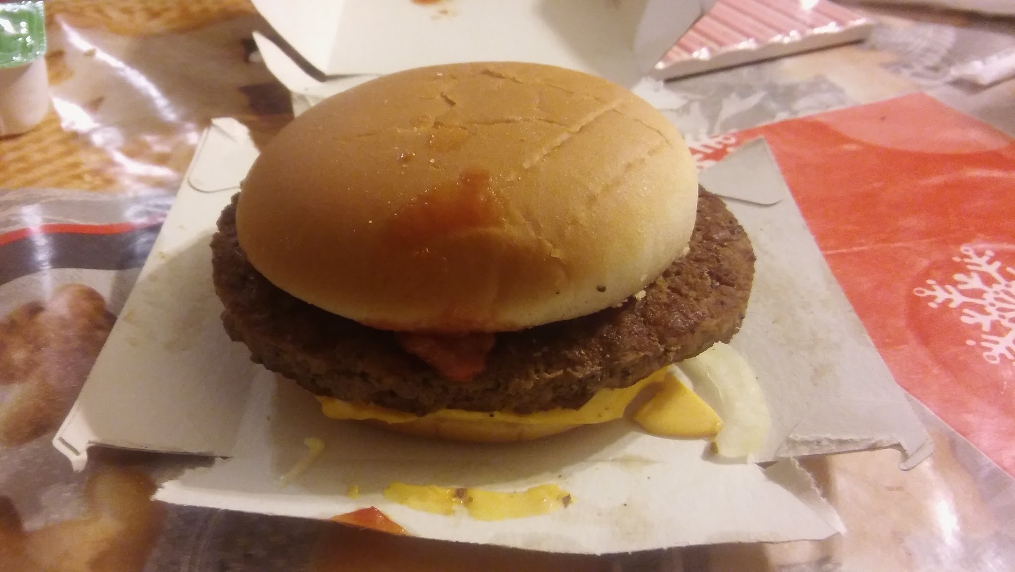 voila a quoi ressemble le triple cheese a marsac-sur-l'isle après pas loin de 20 minutes d'attente a l'intérieur (on était quand même 4 a avoir commandé en même temps) juste déplorable comme d'habitude ...