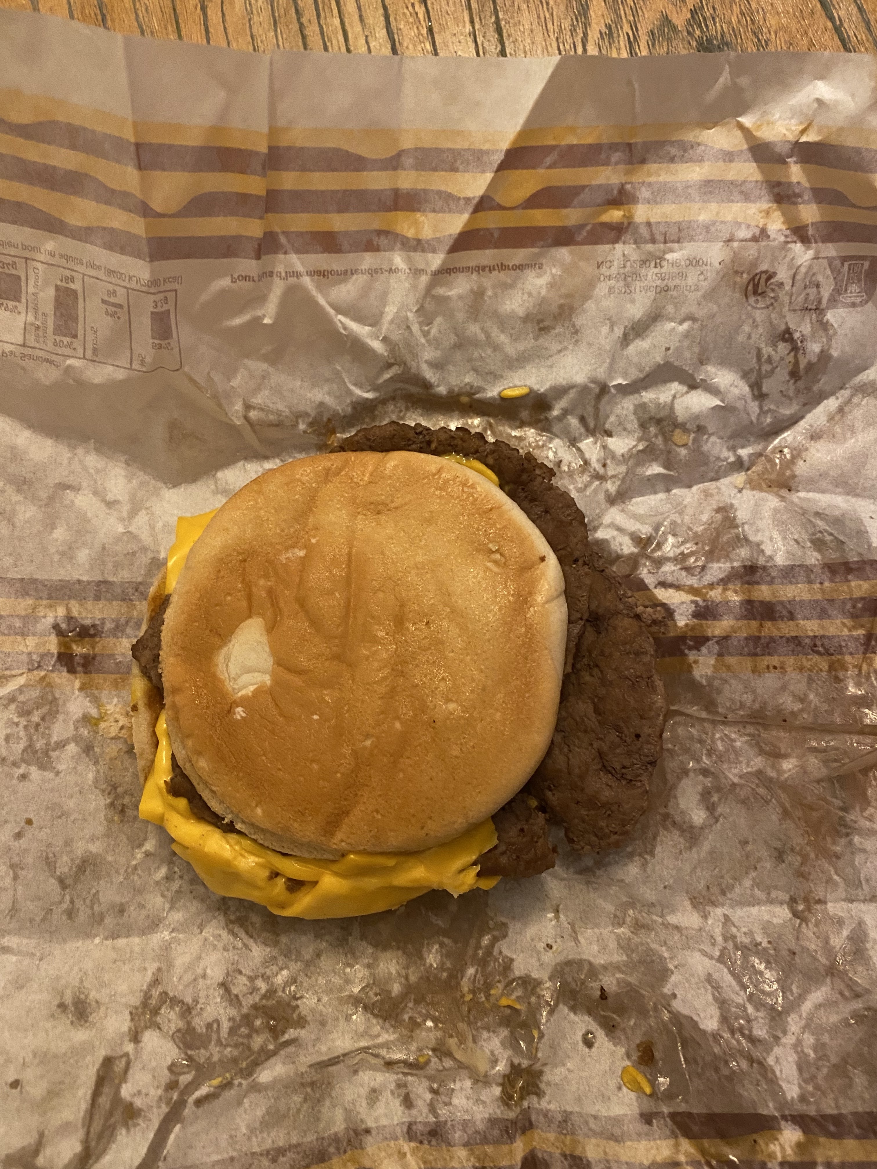 Je viens juste d'arriver chez moi et c'était une commande à emporter, j'ai vérifié avant de partir et j'ai vu l'emballage double cheese donc je m'attendais à ce que tout soit okay. Malheureusement, le contenu n'est pas le bon. Ça c'est un cheese basique pas un double. Honnêtement il n'y avait quasiment personne dans la salle, vous n'étiez pas en plein rush, si c'était le cas j'aurai pu comprendre mais là c'est pas le cas et c'est souvent les erreurs ou les oublis. Ma commande était simple un double cheese et 4 nuggets... J'ai patienté assez longtemps en plus, d'accord il y avait 2-3 voitures au drive mais j'étais toute seule au borne avant que d'autres personnes arrivent un peu plus tard. J'ai payé un sandwich plus cher que celui que j'ai reçu, c'est donc inadmissible !