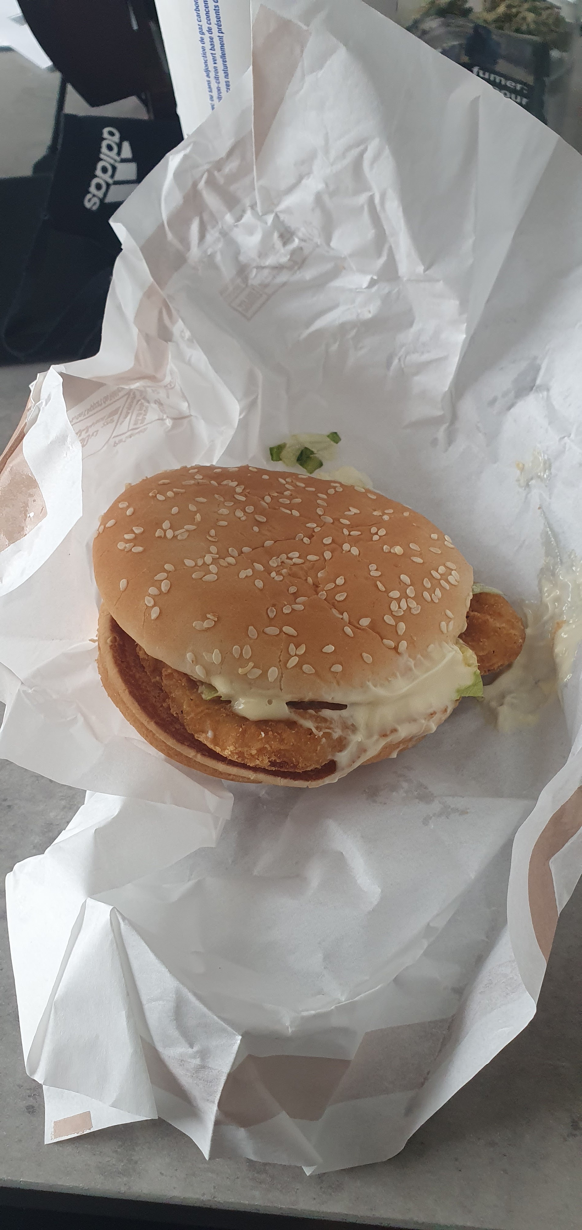 Le sublime mac chicken servi avec amour ça ressemble à la publicité pas vrai ? On ressent vraiment la qualité du travail..... Une honte pour le prix que l'on paye .... pour des experts du burger ça fait pitié .