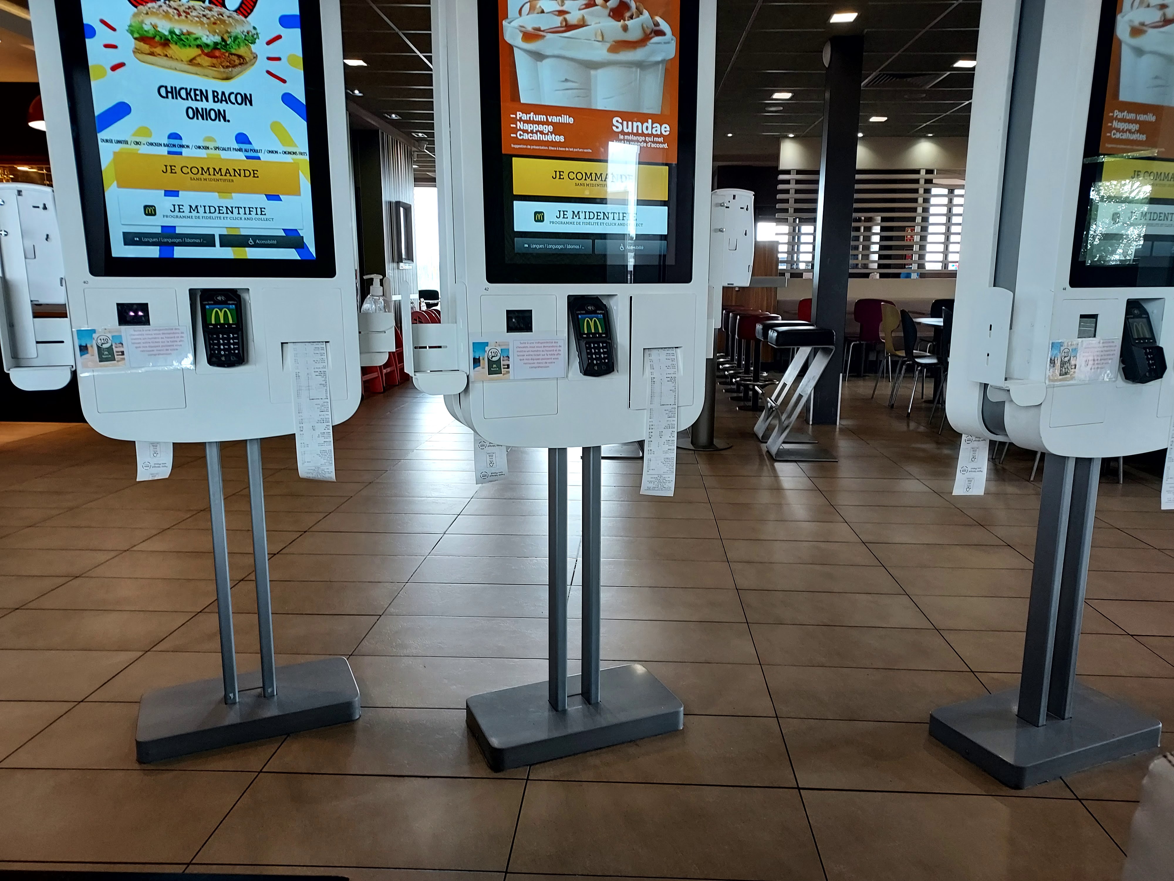 La modernité des prises de commande est adoptée par la clientèle mais côté employé faut revoir les bases hygiène côté terrasse. A notre arrivée les tables sont sales les poubelles débordent, les clients sont obligé d'aller demander des torchons pour nettoyer leurs tables. Une fois fini notre repas nous sommes obligés de laisser notre plateau sur la table car les poubelles n'ont pas été vidées malgré le passage répétitif un employé a la recherche du client pour la réception de sa commande. Il faut revoir la façon de travailler