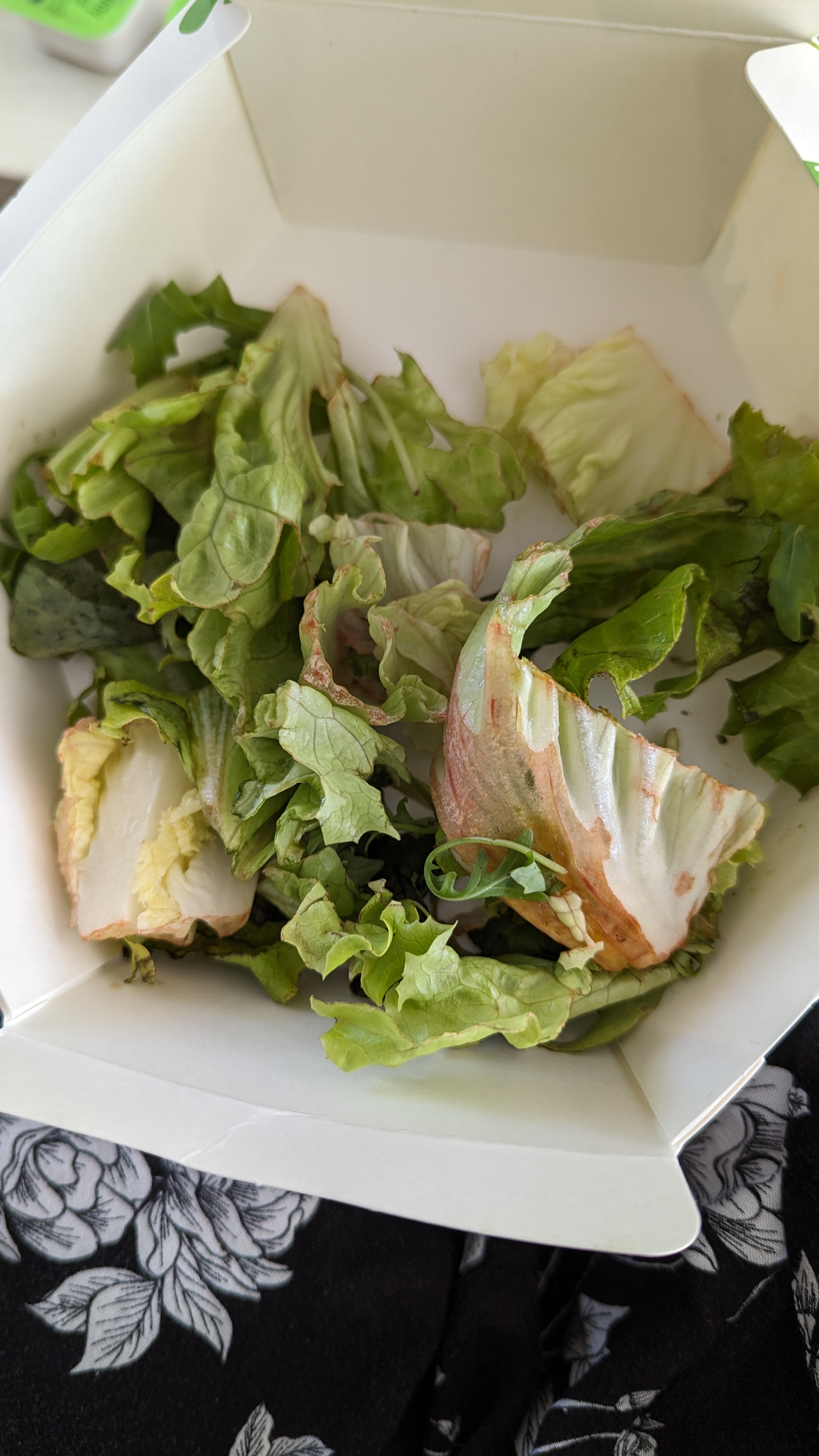 Commande du 03 juin vers 12h30. Drive vide. Servi rapidement mais arrivé chez moi ... J'ouvre la salade... Déjà qu'il n'y ait que de la salade je trouve ça abusé (au moins des tomates cerise ne serait pas mal) mais en plus voilà la tête de ma salade ... Plus bonne et donc immangeable et en plus 3 feuilles de salade deans la boîte ... Très déçu.
