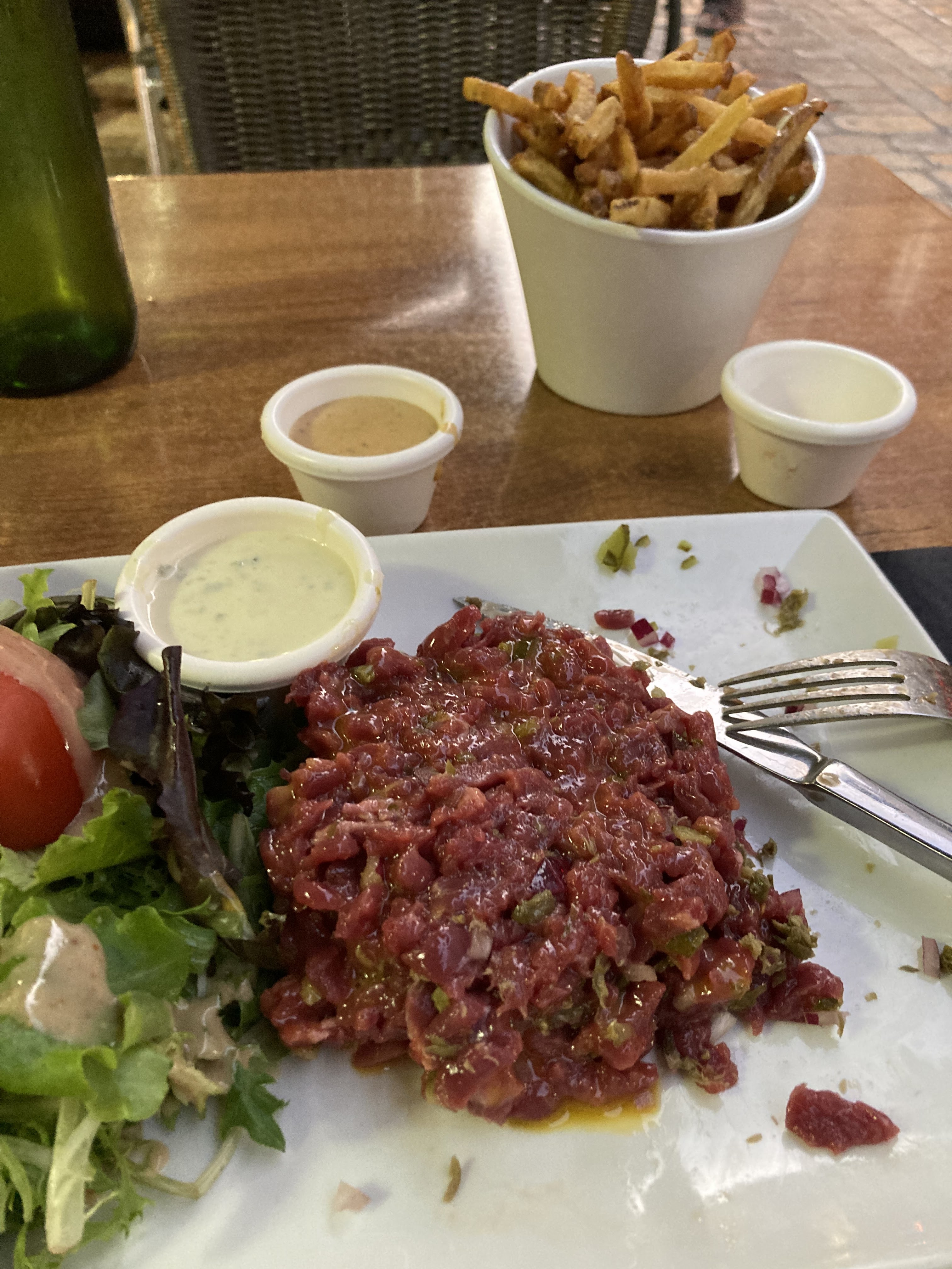 Le tartare de bœuf (charolais et français) est à tomber et se suffit à lui-même! Une belle recommandation et un rapport qualité-prix impeccable 👌🏾 Les desserts maison sont tout aussi excellents Vous pouvez y aller les yeux fermés ! (Sur la photo j'avais déjà préparé mon tartare)