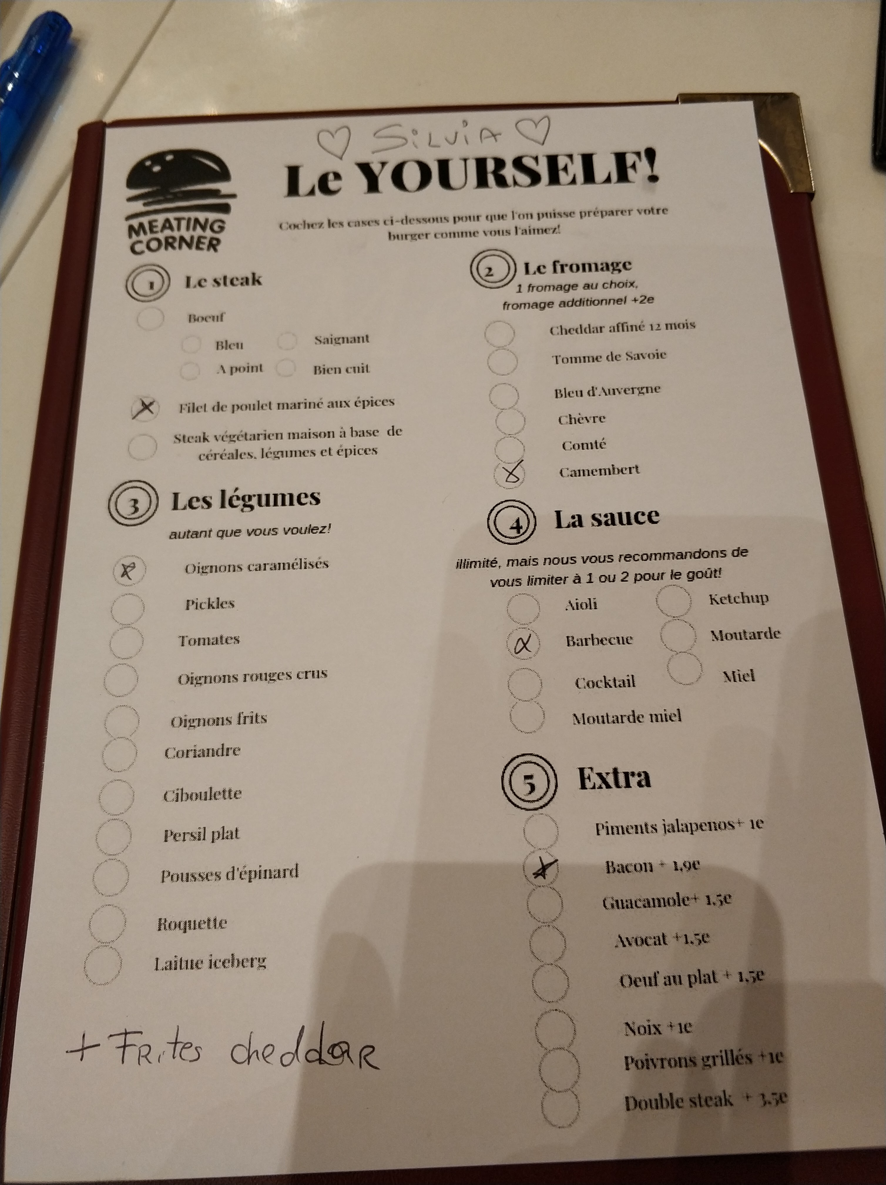 Les burguers sont très bonnes, le prix est correct et le service est bon. L'endroit est propre ainsi que les toilettes. Le +: ils ont une grille a remplir si on veut créer notre propre burguer. On peut tout choisir.