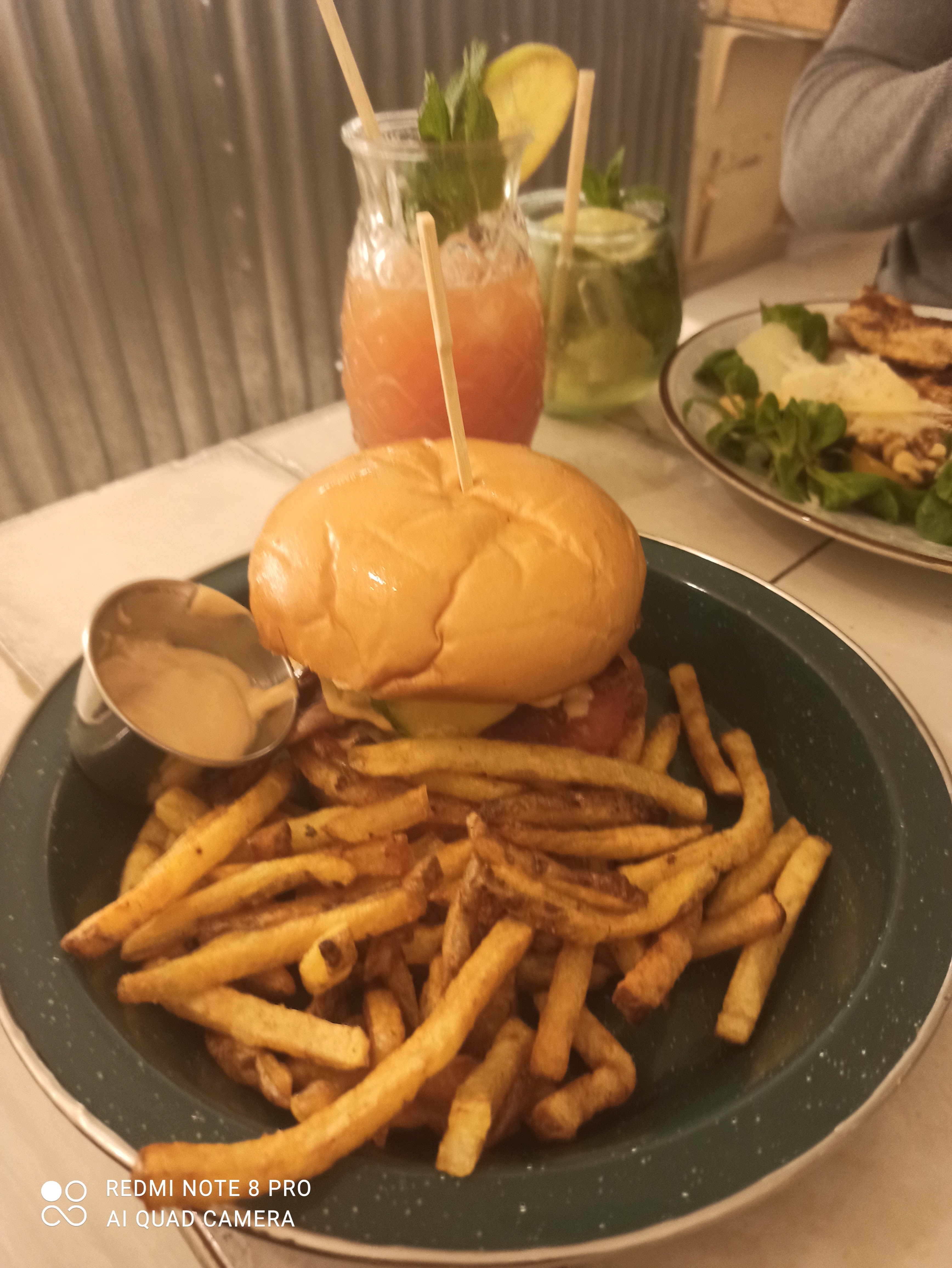 Cocktail mojito framboise vraiment excellent. Service rapide. Hamburgers wife un pur délice et les frites de patate douce également. Serveuse très gentille Je recommande